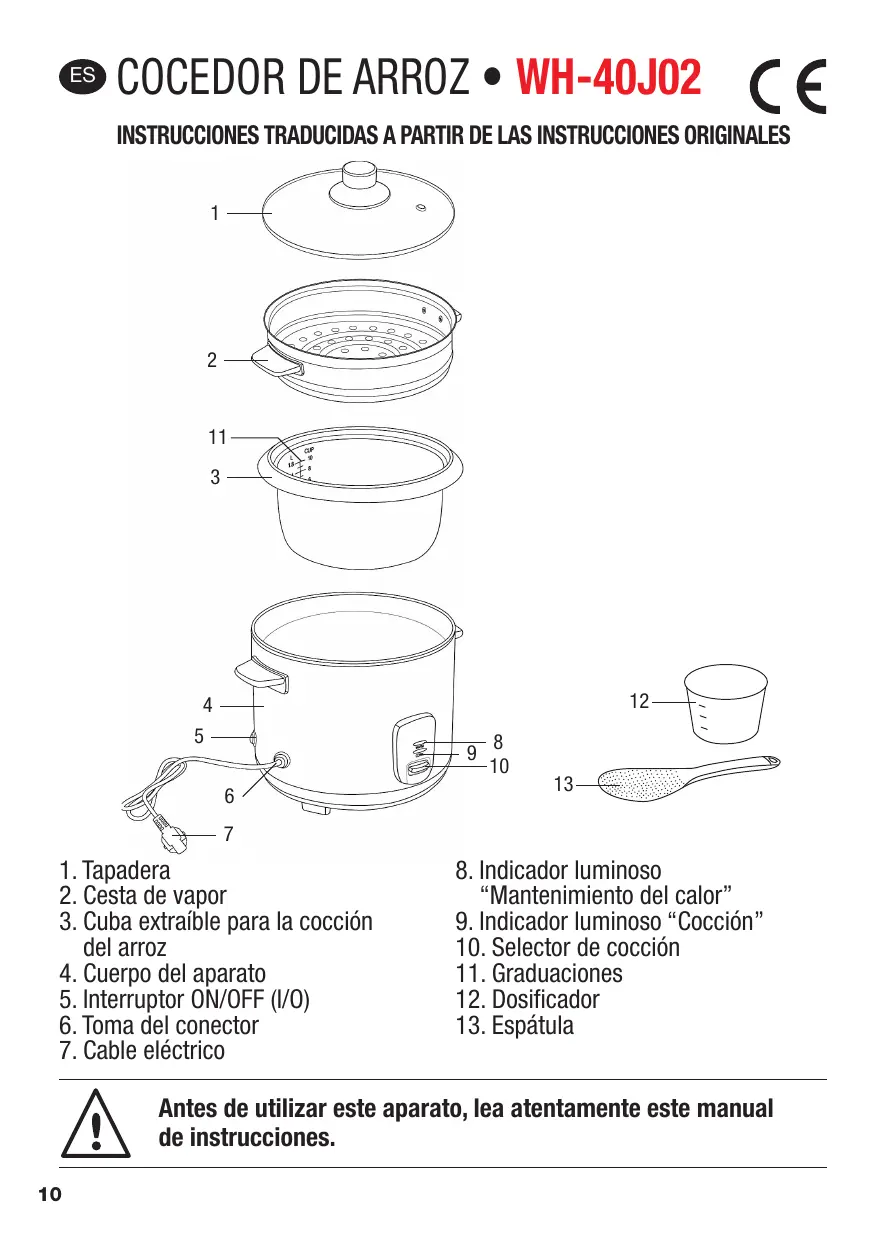 Volumen de arroz Volumen de agua 1 vaso de arroz 1 vaso de agua + ½ vaso de agua 2 vasos de arroz 2 vasos de agua + ½ vaso de agua 3 vasos de arroz 3 vasos de agua + ½ vaso de agua 4 vasos de arroz 4 vasos de agua + ½ vaso de agua Volume de riz Volume d’eau 5 vasos de arroz 5 vasos de agua + ½ vaso de agua 6 vasos de arroz 6 vasos de agua + ½ vaso de agua 7 vasos de arroz 7 vasos de agua + ½ vaso de agua 8 vasos de arroz 8 vasos de agua + ½ vaso de agua 9 vasos de arroz 9 vasos de agua + ½ vaso de agua 10 vasos de arroz 10 vasos de agua + ½ vaso de agua - Coloque la cuba en el cuerpo del aparato. - Cubra el bol con la tapadera. - Asegúrese de que el interruptor se encuentre en la posición OFF (O). Enchufe el conector al aparato y luego a la corriente eléctrica. - Encienda el aparato desplazando el interruptor hasta la posición ON (I). Se encenderá el indicador “Mantenimiento del calor” (indicador luminoso naranja). Pulse el selector de cocción para iniciar la cocción. Se encenderá el indicador luminoso “Cocción” (indicador luminoso rojo) y se apagará el indicador luminoso “Mantenimiento del calor”. - La cocción es automática. Una vez finalizada la cocción del arroz, el selector de cocción volverá a ascender automáticamente (debería oír un clic). El aparato pasará a la función “Mantenimiento del calor”. Espere unos instantes antes de servirlo. - En caso de que desee mantener el arroz caliente, no desconecte el aparato. El aparato permanece en este nivel mientras no se desconecte. - Cuando sirva el arroz, retire la tapadera y tenga cuidado con la expulsión del vapor. Manipule la tapadera y la cuba con guantes. - En caso de que desee retirar la cuba, utilice guantes, ya que esta pieza se encuentra a una temperatura elevada. - Una vez que termine de usar el aparato, apáguelo y desenchufe la toma del aparato y de la alimentación eléctrica.