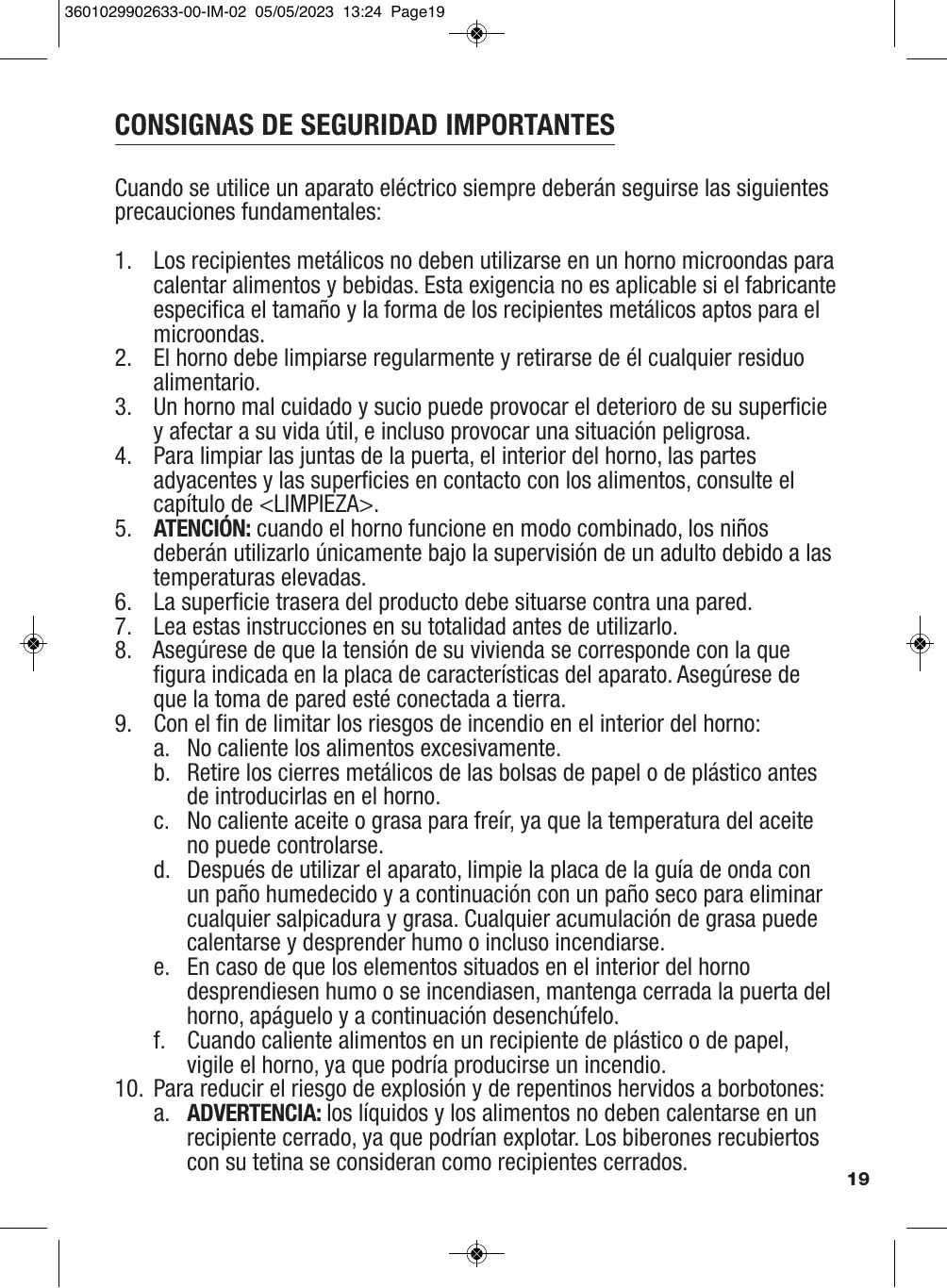 b. Utilice un recipiente ancho para calentar líquidos. Los líquidos calientes no deben retirarse inmediatamente del horno. Es preferible esperar unos instantes antes de retirarlos para evitar cualquier peligro provocado por el desbordamiento de un líquido hirviendo. c. Las patatas, salchichas y castañas deben pelarse o pincharse antes de la cocción. Los huevos en su cáscara y los huevos duros enteros no deben calentarse en el horno microondas, ya que podrían explotar, incluso cuando el horno ya no esté calentando. d. El contenido de los biberones y de los potitos para bebé debe mezclarse o removerse y su temperatura debe comprobarse antes de consumirlos para evitar cualquier riesgo de sufrir quemaduras. Para evitar cualquier peligro, si el cable de alimentación estuviera dañado, deberá ser sustituido por el fabricante, un técnico autorizado o un profesional cualificado. Tras la cocción, los recipientes se encuentran a una temperatura elevada. Utilice guantes de protección para retirar los alimentos y evitar cualquier riesgo de sufrir quemaduras con el vapor. Mantenga el rostro y las manos alejados del vapor. Levante con cuidado el extremo más alejado de la tapa de la bandeja y del embalaje de plástico, y a continuación abra con cuidado las bolsas de palomitas o de cocción, manteniéndolas alejadas del rostro. Para evitar que la bandeja giratoria se rompa: a. Espere a que la bandeja giratoria se enfríe antes de lavarla. b. No coloque alimentos o utensilios calientes sobre la bandeja giratoria cuando esté fría. c. No coloque alimentos o utensilios congelados sobre la bandeja giratoria cuando esté caliente. Procure que los utensilios no toquen las paredes interiores durante la cocción. Utilice únicamente utensilios adaptados al microondas. No guarde alimentos u otros elementos dentro del horno. No utilice el microondas sin haber introducido en él líquido o alimentos, ya que de lo contrario podría dañarse. Cuando el horno funcione en modo combinado, los niños deberán utilizarlo únicamente bajo la supervisión de un adulto debido a las temperaturas elevadas. Cualquier accesorio no recomendado por el fabricante puede provocar heridas. No utilice el aparato en el exterior. Conserve estas instrucciones. ADVERTENCIA: en caso de que la puerta o las juntas de la puerta estén dañadas o de que el horno no funcione correctamente, no lo utilice sin haberlo llevado antes a reparar por un técnico cualificado. 3601029902633-00-IM-02 05/05/2023 13:24 Page21