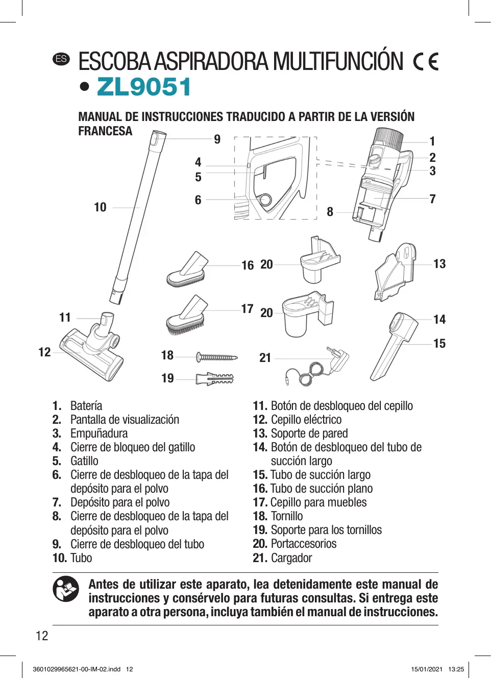 5. La pila debe retirarse del aparato antes de que éste se deseche. El usuario puede retirar la batería. Consulte el apartado INSTALACIÓN en el que figuran los detalles sobre la manera de retirar la batería. 6. El cargador debe desconectarse de la red eléctrica cuando se vaya a retirar la batería. 7. La pila debe eliminarse de forma segura. 8. No sumerja la aspiradora o el cargador en agua ni en ningún otro líquido. No utilice el aparato con las manos mojadas. 9. Utilice la aspiradora solo en interiores y recárguela también solo en interiores. 10. No aspire nunca sustancias mojadas o líquidas ni sustancias tóxicas, inflamables o combustibles como gasolina. No utilice la aspiradora cerca de explosivos o de humos inflamables. • El tiempo de carga es de aprox. 4 horas. • La batería debe cargarse en un entorno seco y a temperatura ambiente. • Le recomendamos que cargue y descargue el aparato cada dos meses si no tiene previsto utilizarlo durante un largo período. • No desmonte, aplaste ni agujeree la batería. • No la tire al fuego. • No la exponga a temperaturas elevadas o a la luz directa del sol. • No la queme.