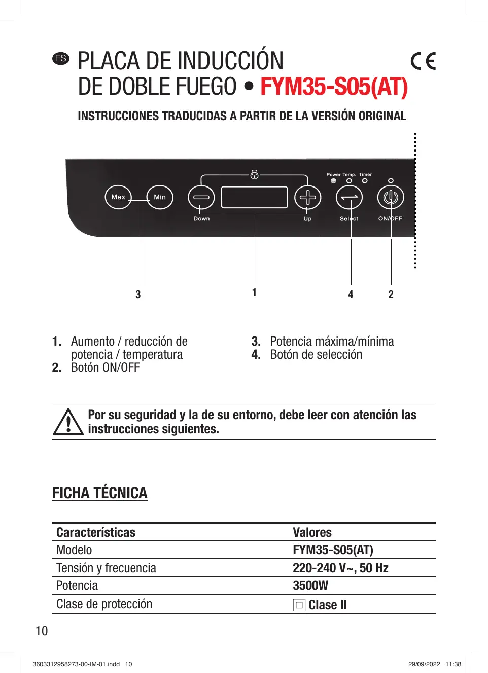 Características Modelo Tensión y frecuencia Potencia Clase de protección Valores FYM35-S05(AT) 220-240 V~, 50 Hz 3500W Clase II