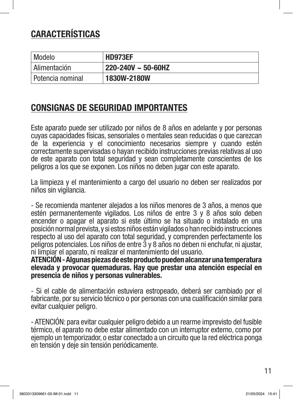 ATENCION - Algunas piezas de este producto poder alcanzar una temperatura elevada y provocar quemaduras. Hay que prestar una atencion especial en presencia de niños y personas vulnerables.