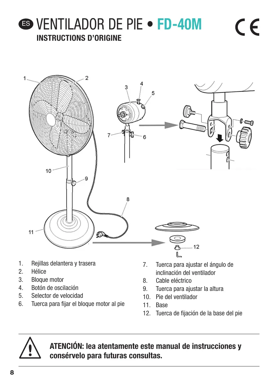 • Le nettoyage et l’entretien par l’usager ne doivent pas être effectués par des enfants sans surveillance. • Si le câble d'alimentation est endommagé, il doit être remplacé par le fabricant, son service après-vente ou des personnes de qualification similaire afin d'éviter un danger. • Avant de manipuler ou de déplacer l’appareil, soyez sûr que celui-ci est débranché. • Pour débrancher de l’alimentation électrique, prendre la prise et la retirer. NE PAS TIRER SUR LE CORDON. • Ne pas introduire des objets de quelle que nature que ce soit dans la grille pendant que l’appareil est en marche, CELA OCCASIONNERA DE GRAVES BLESSURES À LA PERSONNE. • Le fonctionnement de tout appareil électrique doit faire l’objet d’une surveillance continue en présence d’enfants. Cet appareil n’est pas un jouet. • Ne pas utiliser l’appareil dans des zones humides, dans des zones où la température excède les 40 °C ou dans des zones poussiéreuses. • Ne pas exposer un bébé ou une personne malade devant l’appareil trop longtemps et sans interruption. • Assurez-vous que l’endroit où se trouve l’appareil est stable. • Cet appareil est destiné seulement à un usage ménager. Tout entretien autre que le nettoyage ou l’entretien courant effectué par l’utilisateur doit être fait par un électricien compétent. • Une fois assemblé, le ventilateur ne doit plus être démonté. • L’utilisation de tout appareil électrique implique l’observation de quelques règles fondamentales : NE PAS TOUCHER L’APPAREIL AVEC LES MAINS OU LES PIEDS HUMIDES OU MOUILLES – NE PAS UTILISER L’APPAREIL EN EXTERIEUR – NE PAS TIRER LE CABLE D’ALIMENTATION OU L’APPAREIL LUI-MEME POUR DEBRANCHER LA FICHE DE LA PRISE DE COURANT. 4