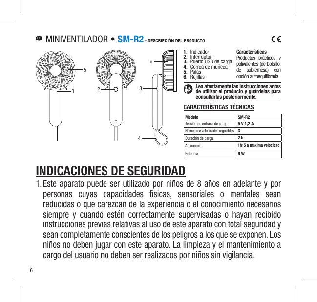 5. Cuando la batería esté baja la potencia del aire se reducirá y el aparato se apagará automáticamente cuando se agote la batería. 6. Este aparato utiliza una batería de litio‑ion; no tiene que esperar a que la batería se haya agotado para recargarla; cargar regularmente la batería permite prolongar su vida útil. 7. Cuando el ventilador está funcionando, las palas giran con gran rapidez. Está prohibido introducir objetos en el interior del aparato para no dañarlo. 8. Si no va a utilizar el ventilador durante mucho tiempo, deberá recargar la batería, guardarla en una bolsa de plástico sellada y almacenarla en un lugar seco y fresco. 9.La vida útil de la batería se reducirá considerablemente si: - la batería se utiliza a una temperatura ambiente superior a 60°C, - la batería se comprime o fisura, Estos riesgos también pueden provocar un riesgo de fuga o de explosión. 10. La batería del aparato solo debe cambiarla una persona cualificada. 11. El aparato solo debe alimentarse a una tensión de seguridad muy baja de conformidad con la marca en el aparato. 7