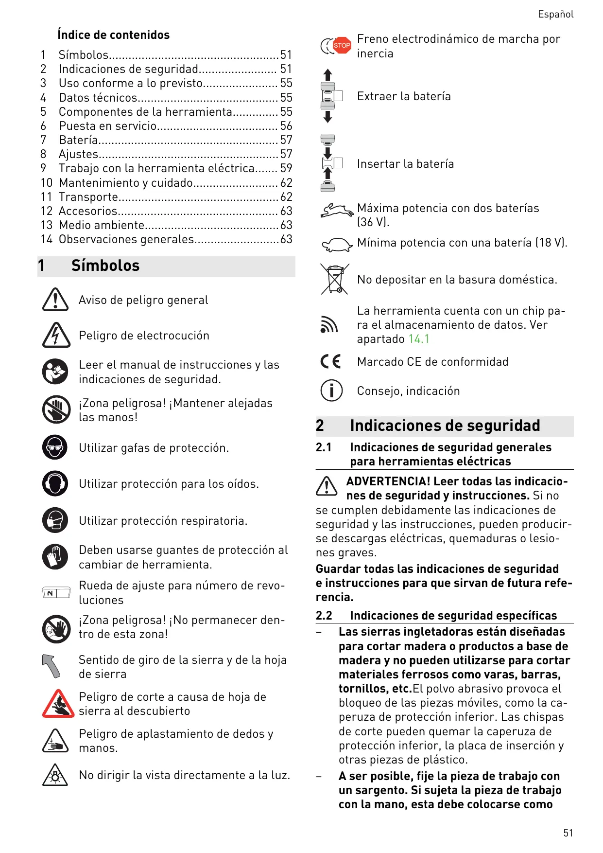 – Posición de trabajo correcta: – delante, en el lado del usuario; – frente a la sierra; – junto a la línea de la hoja de sierra. – Al trabajar, la herramienta eléctrica de be agarrarse siempre por la empuñadura [1-7] con la mano de manejo. Mantener la mano libre siempre fuera de la zona de pe ligro. – Adaptar la velocidad de avance para evitar que se sobrecalienten los filos de la hoja de sierra o que se derrita el plástico al serrarlo. Cuanto más duro sea el material a serrar, menor debe ser la velocidad de avance. – Dirija la herramienta eléctrica hacia la pie za de trabajo solo cuando esté conectada. – Cuando no se utilice la herramienta eléc trica, extraer ambas baterías de la herra mienta eléctrica. Así optimizará la vida útil de la electrónica. Comprobación de la movilidad de la cubierta protectora basculante ADVERTENCIA La cubierta protectora bascu lante debe moverse siempre libremente y po derse cerrar por sí sola. ► Extraer la batería. ► Agarrar la cubierta protectora basculante con la mano y probar a introducirla en el grupo de serrado. La cubierta protectora basculante debe po der moverse con facilidad y hundirse prácti camente del todo en el protector pendular. Limpieza de la zona de la hoja de sierra ► Mantener limpia la zona que rodea la cu bierta protectora basculante. ► Limpiar el polvo y las virutas con una bro cha o aplicando aire comprimido.