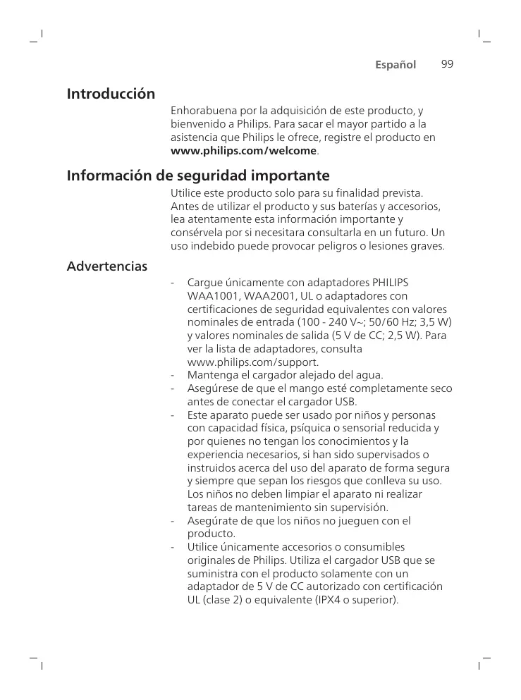 - Utilisez exclusivement des accessoires ou des consommables de la marque Philips. Utilisez uniquement le chargeur USB fourni avec le produit avec un adaptateur SV CC (IPX4 ou supérieur) homologué UL (classe 2) ou équivalent.