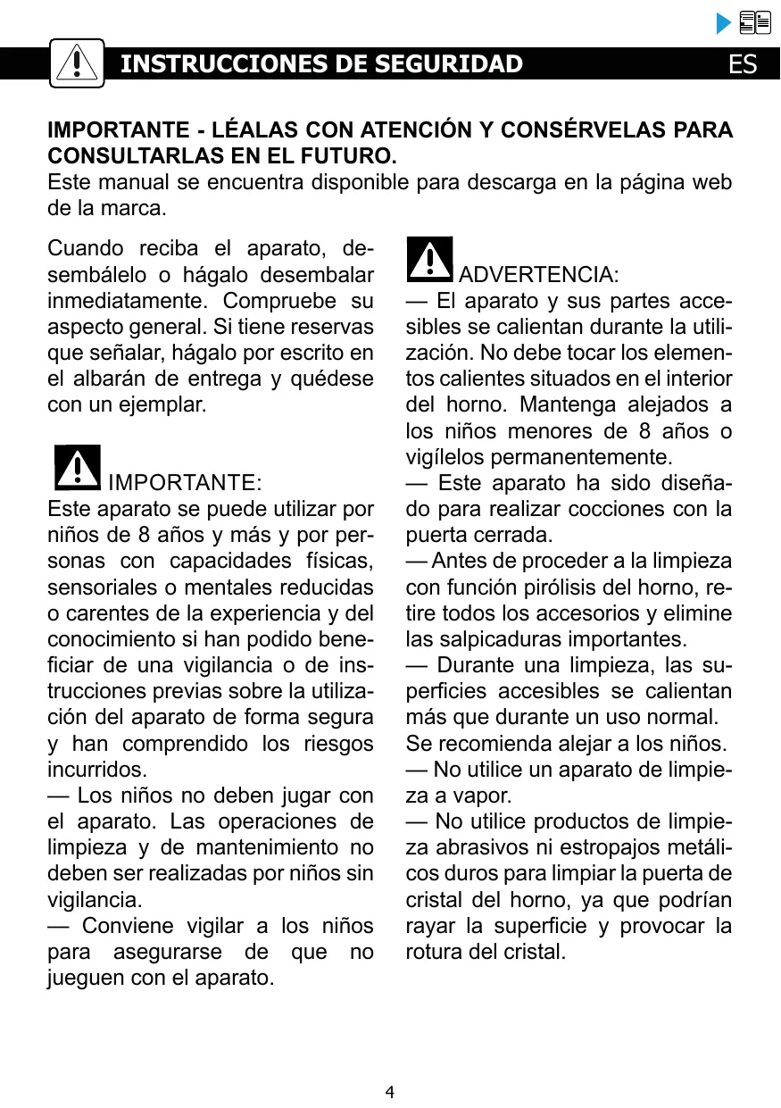 IMPORTANTE - LÉALAS CON ATENCION Y CONSÉRVELAS PARA CONSULTARLAS EN EL FUTURO. Este manual se encuentra disponible para descarga en la pâgina web de la marca. Cuando reciba el aparato, de- sembälelo o hägalo desembalar inmediatamente. Compruebe su aspecto general. Si tiene reservas que señalar, hägalo por escrito en el albarän de entrega y quédese con un ejemplar. EN IMPORTANTE: Este aparato se puede utilizar por niños de 8 años y mâs y por per- sonas con capacidades fisicas, sensoriales o mentales reducidas o carentes de la experiencia y del conocimiento si han podido bene- ficiar de una vigilancia o de ins- trucciones previas sobre la utiliza- ciôn del aparato de forma segura y han comprendido los riesgos incurridos. — Los niños no deben jugar con el aparato. Las operaciones de limpieza y de mantenimiento no deben ser realizadas por niños sin vigilancia. — Conviene vigilar a los niños para asegurarse de que no jueguen con el aparato. EN ADVERTENCIA: — El aparato y sus partes acce- sibles se calientan durante la utili- zaciôn. No debe tocar los elemen- tos calientes situados en el interior del horno. Mantenga alejados a los niños menores de 8 años o vigilelos permanentemente. — Este aparato ha sido diseña- do para realizar cocciones con la puerta cerrada. — Antes de proceder a la limpieza con funciôn pirélisis del horno, re- tire todos los accesorios y elimine las salpicaduras importantes. — Durante una limpieza, las su- perficies accesibles se calientan ms que durante un uso normal. Se recomienda alejar a los niños. — No utilice un aparato de limpie- Za a vapor. — No utilice productos de limpie- za abrasivos ni estropajos metäli- cos duros para limpiar la puerta de cristal del horno, ya que podrian rayar la superficie y provocar la rotura del cristal.