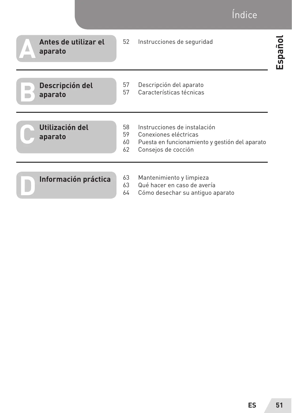 Indice Español Antes de utilizar el 52 Instrucciones de seguridad aparato Descripciôn del 57 Descripcion del aparato aparato 57 Caracteristicas técnicas Utilizaciôon del 58 Instrucciones de instalaciôn aparato 59 Conexiones eléctricas 60 Puesta en funcionamiento y gestion del aparato 62 Consejos de cocciôn Informaciôn präctica 63 Mantenimiento y limpieza 63 Qué hacer en caso de averia 64 Como desechar su antiguo aparato ES 51