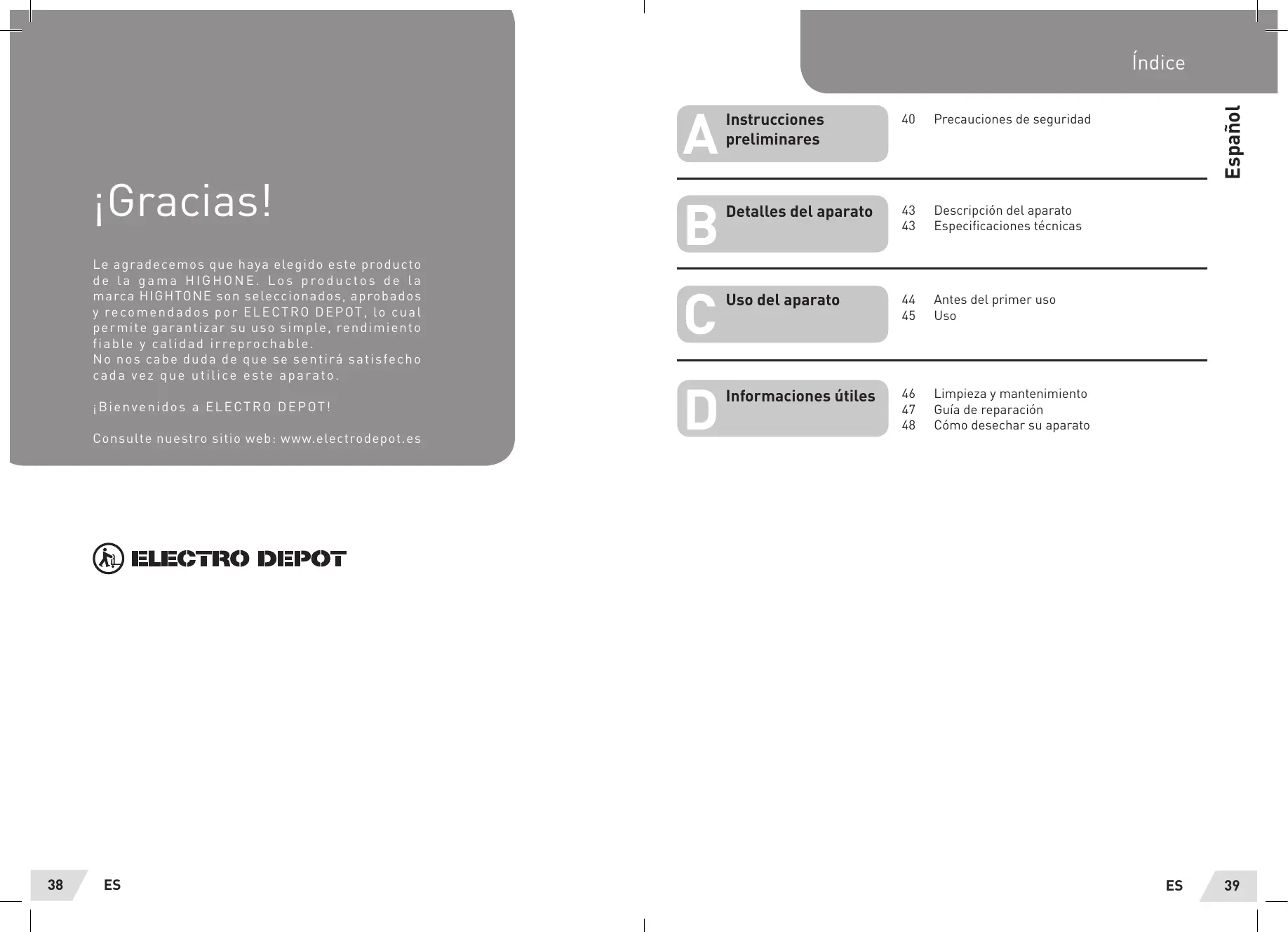 Le agradecemos que haya elegido este producto de la gama HIGHONE. Los produits de lamarca HIGHTONE son seleccionados,aprobados y recomendados por ELECTRO DEPOT, lo cual permite garantizar su uso simple, rendimiento fiable y calidad irreproachable.
