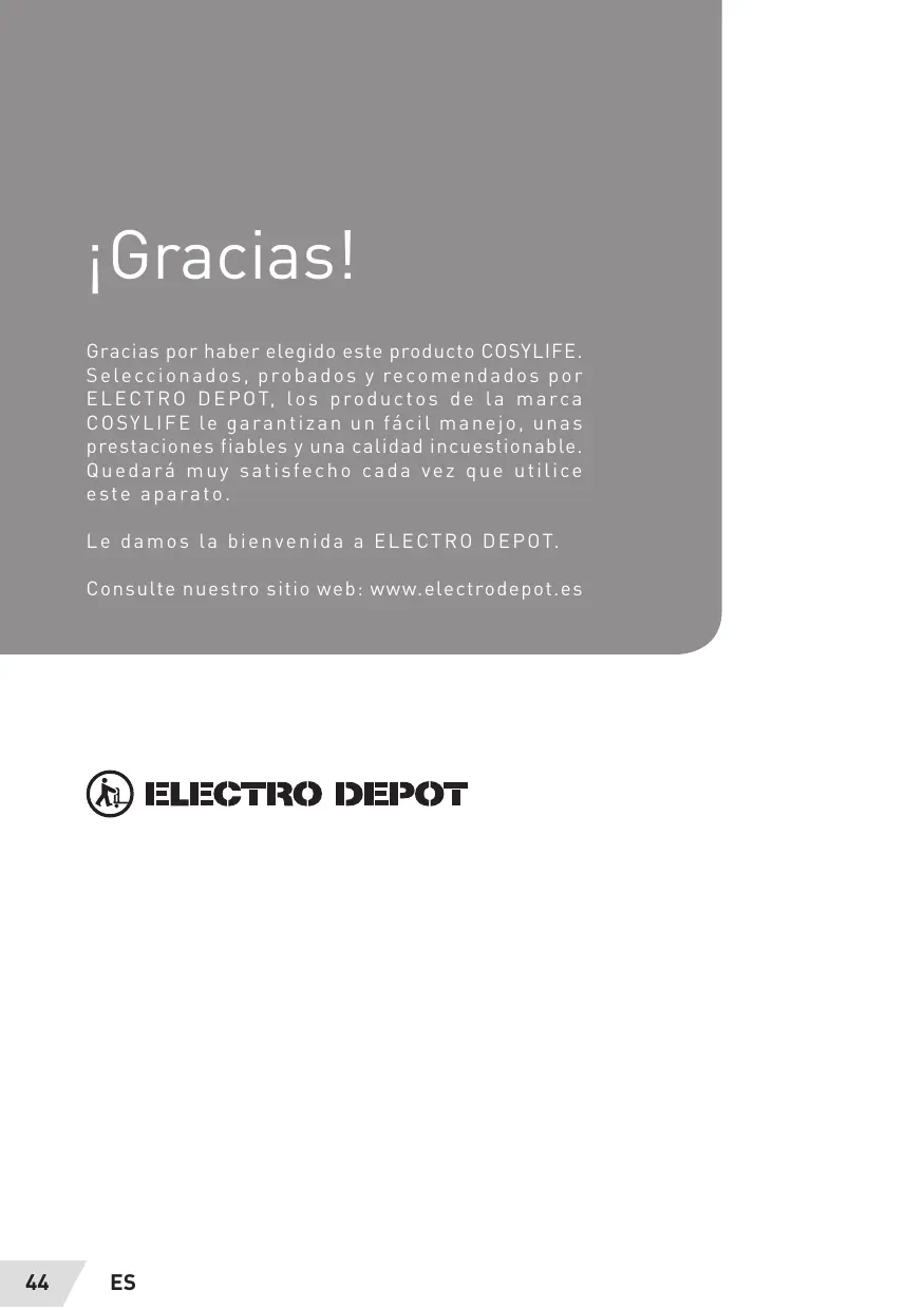 jGraciasl Gracias por haber elegido este producto COSYLIFE. Seleccionados, probados y recomendados por ELECTRO DEPOT, los productos de La marca COSYLIFE Le garantizan un fâcil manejo, unas prestaciones fiables y una calidad incuestionable. Quedaré muy satisfecho cada vez que utilice este aparato Le damos la bienvenida a ELECTRO DEPOT. Consulte nuestro sitio web: www.electrodepot.es