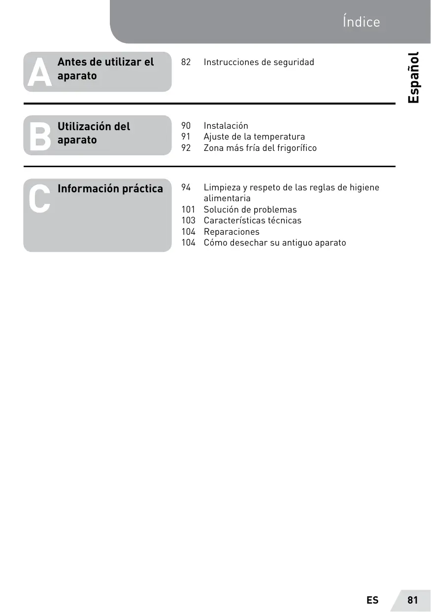 ES Antes de utilizar el 82 Instrucciones de seguridad aparato Utilizaciôn del 90 Instalacién 91 Ajuste de La temperatura aparato ï p P 92 Zona mâs fria del frigorifico Informacion präctica 94 Limpieza y respeto de Las reglas de higiene alimentaria 101 Solucién de problemas 103 Caracteristicas técnicas 104 Reparaciones 104 Cémo desechar su antiguo aparato