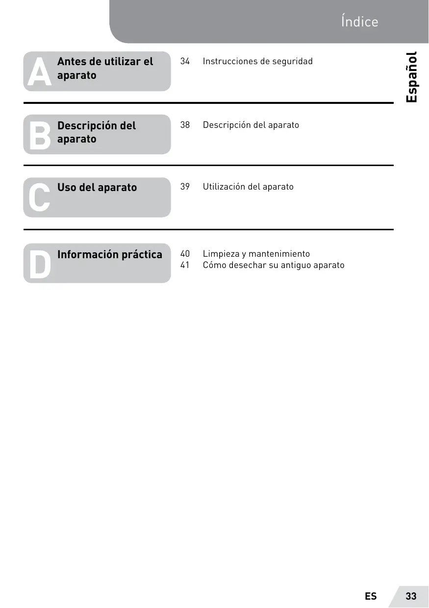 Antes de utilizar el 34 Instrucciones de seguridad aparato Descripciôn del 38 Descripciôn del aparato aparato Uso del aparato 39 Utilizacién del aparato Informaciôn präctica 40 Limpieza y mantenimiento 41 Cémo desechar su antiguo aparato