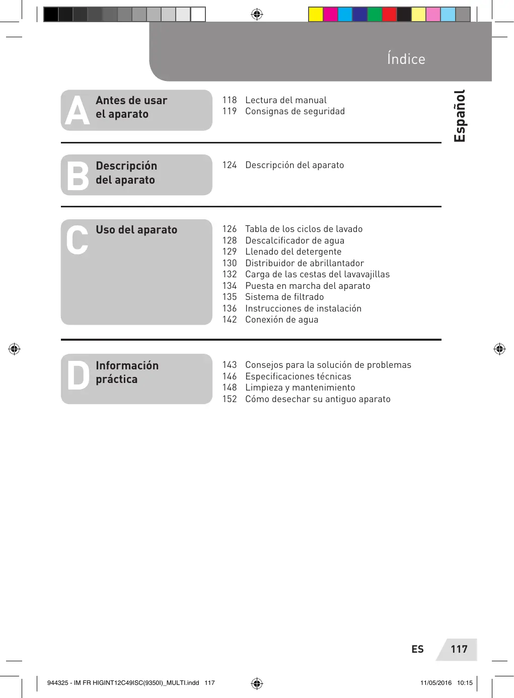Este manual contiene capitulos relativos a las consignas de seguridad, utilizaciôn, instalaciôn, consejos para la soluciôn de problemas, etc. Una lectura minuciosa de este manual antes de utilizar el lavavajillas Le ayudarä a utilizar y mantener el lavavajillas correctamente.