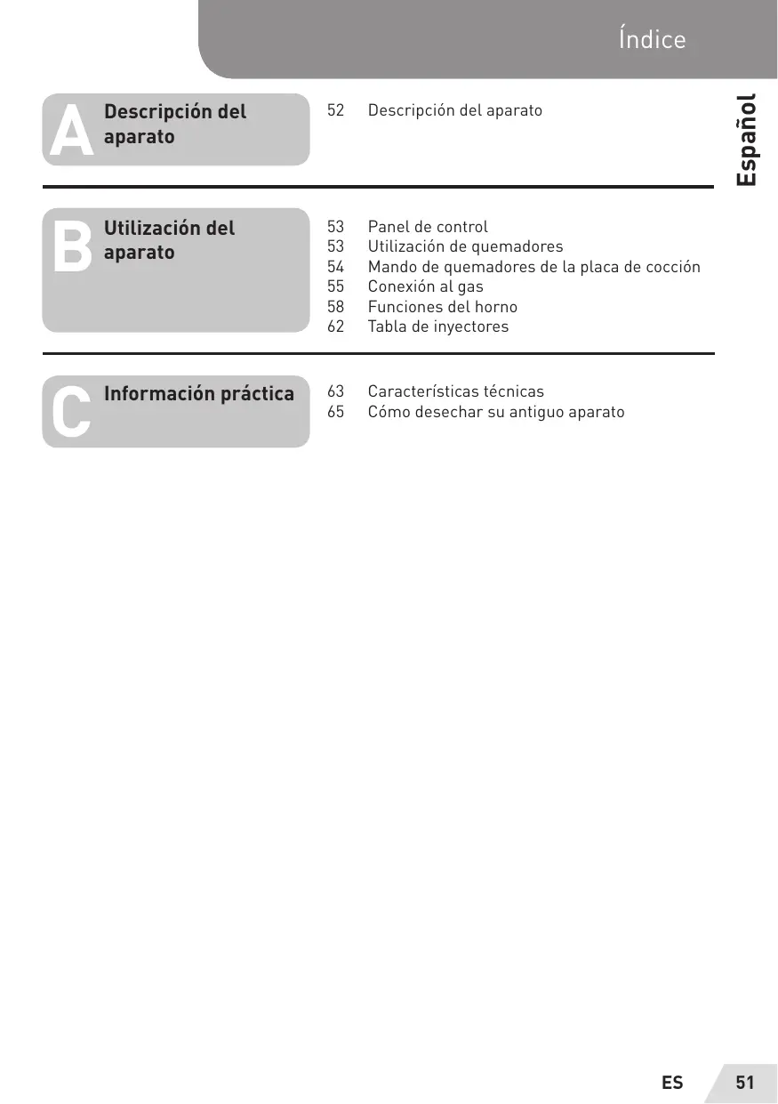 54 Mando de quemadores de la placa de cocciôn 55 Conexiôn al gas