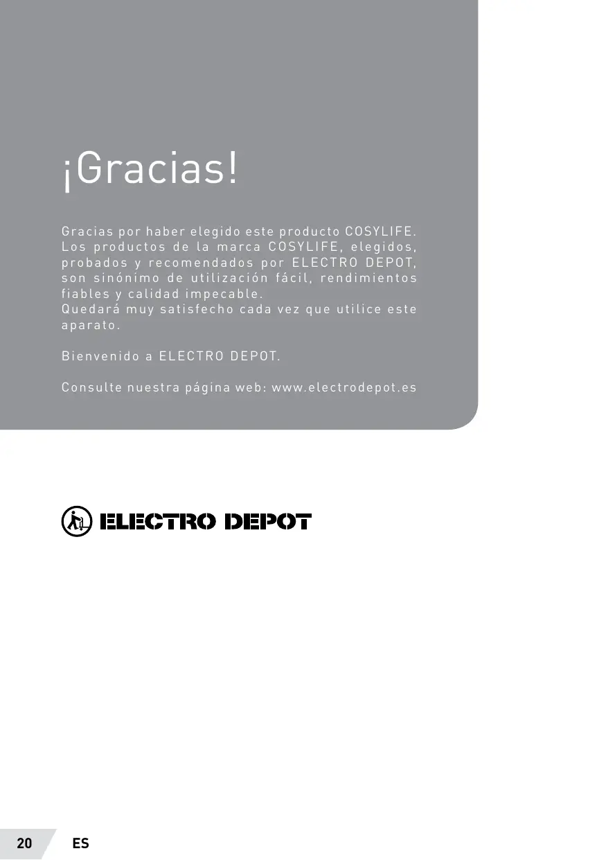 jGraciasl Gracias por haber elegido este producto COSYLIFE Los productos de La marca COSYLIFE, elegidos, probados y recomendados por ELECTRO DEPOT, son sinénimo de utilizacién fâcil, rendimientos fiables y calidad impecable. Quedaré muy satisfecho cada vez que utilice este aparat Bienvenido a ELECTRO DEPOT. Consulte nuestra pâgina web: www.electrodepot.es 20 ES