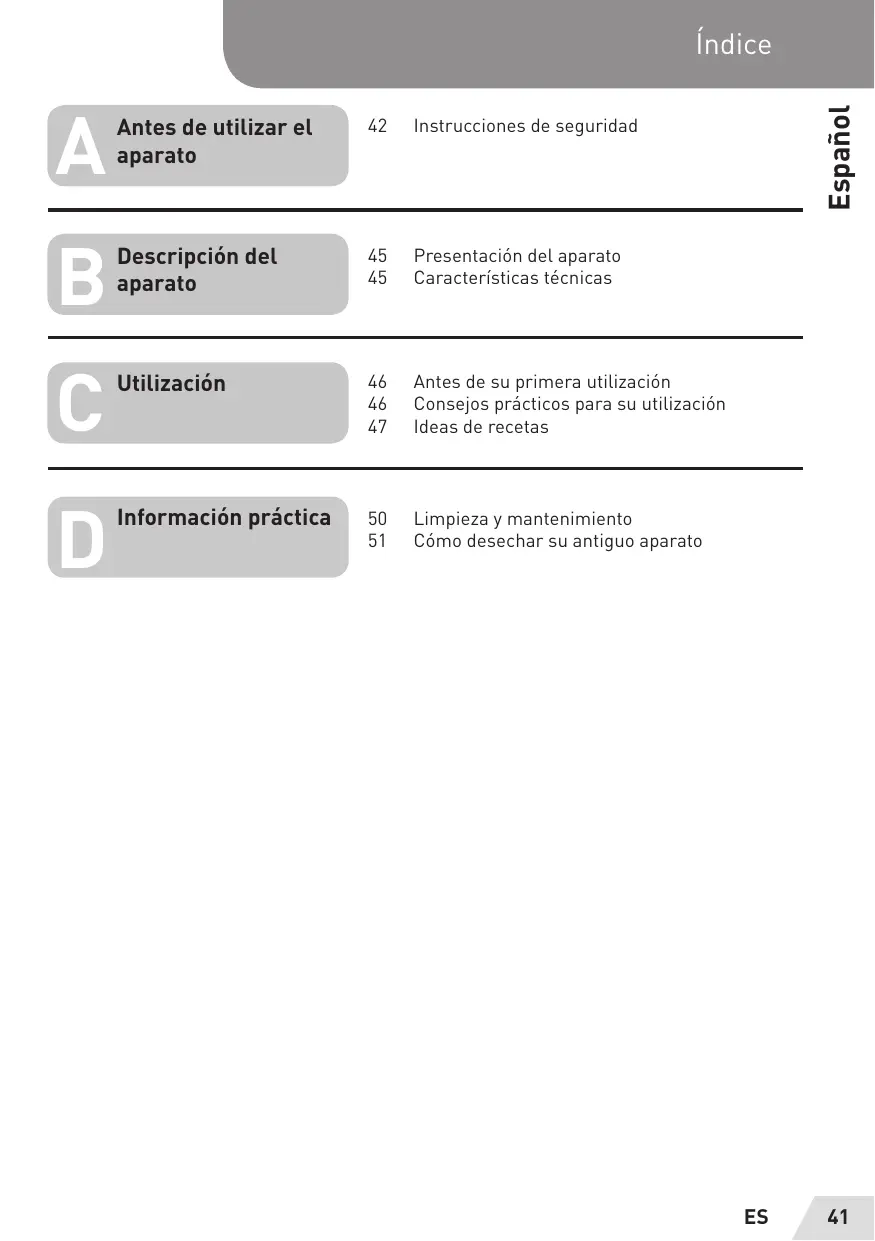 Antes de utilizar el 42 Instrucciones de seguridad aparato Descripciôn del 45 Presentaciôn del aparato aparato 45 Caracteristicas técnicas Utilizaciôn 46 Antes de su primera utilizaciôn 46 Consejos präcticos para su utilizaciôn 47 Ideas de recetas Informaciôn prâctica 50 Limpieza y mantenimiento 51 Cémo desechar su antiguo aparato