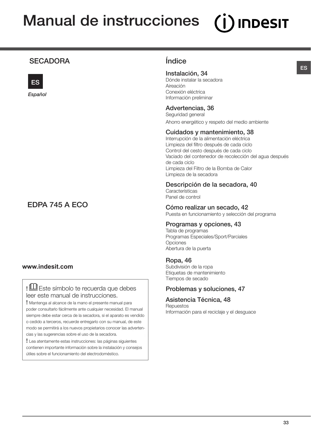 MANUAL DE USUARIO EDPA 745 A1 ECO (EU) INDESIT
