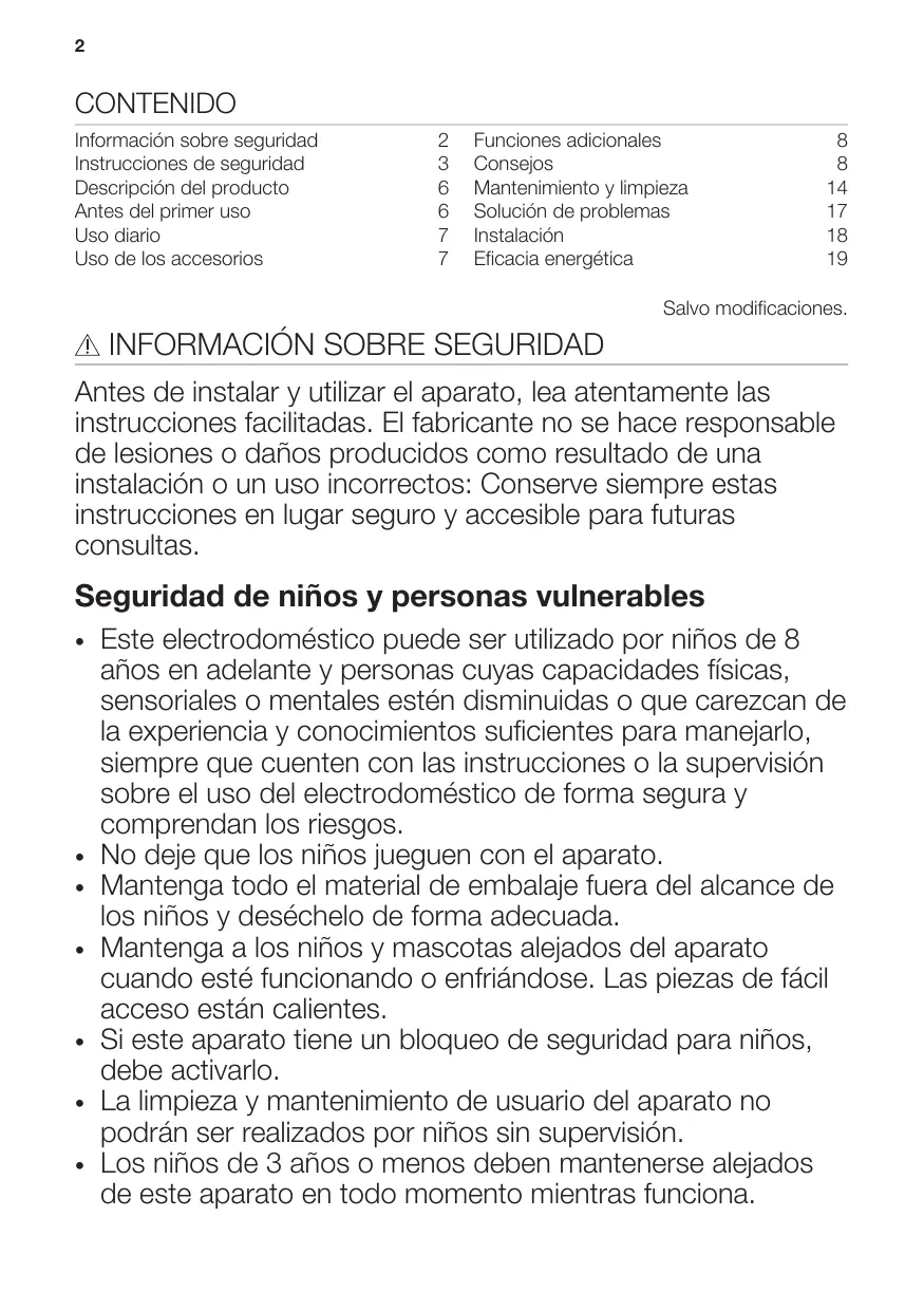 - Este electrodométrico puede ser utilisé por niños de 8 años en adelante y personas@cuyas capacidades físicas, sensoriales o mentalaes estén disminuidas o que carezcan de la experiencia y conocimientos suficientes para manejarlo, siempre que@cuenten con las instrucciones o la supervisión sobre el uso del electrodométrico de forma segura y comprendan los riesgos.