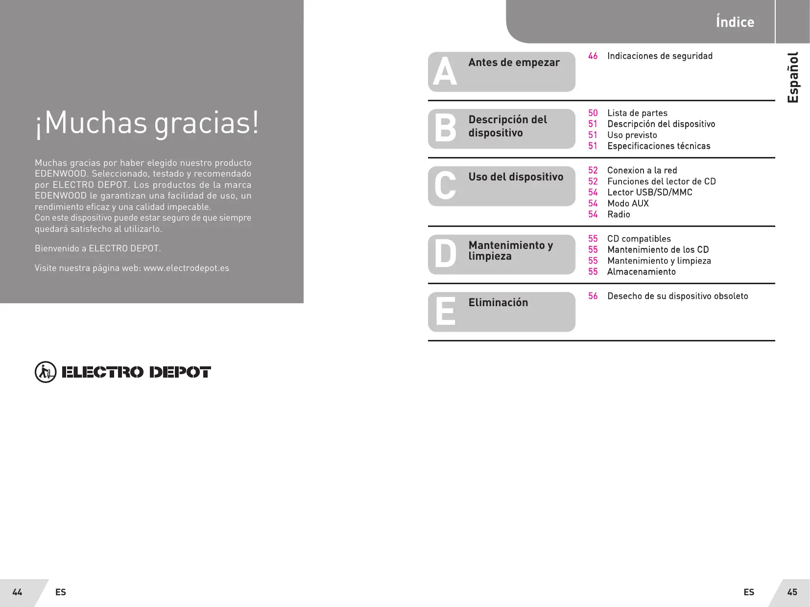 iMuchas gracias! Muchas gracias por haber elegido nuestro producto EDENWOOD. Seleccionado, testado y recomendado por ELECTRO DEPOT. Los productos de la marca EDENWOOD Le garantizan una facilidad de uso, un rendimiento eficaz y una calidad impecable. Con este dispositivo puede estar seguro de que siempre quedarä satisfecho al utilizarlo. Bienvenido a ELECTRO DEPOT. Visite nuestra pâgina web: www.electrodepot.es TRO DEPOT