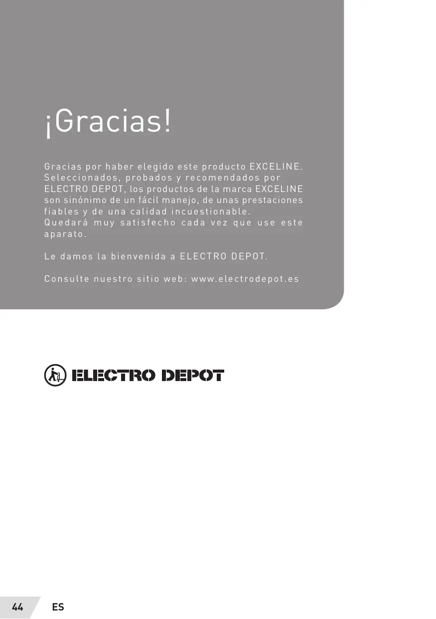 jGraciasl Gracias por haber elegido este producto EXCELINE. Seleccionados, probados y recomendados por ELECTRO DEPOT, Los productos de La marca EXCELINE son sinénimo de un fâcil manejo, de unas prestaciones fiables y de una calidad incuestionable. Quedarä muy satisfecho cada vez que use este aparato. Le damos la bienvenida a ELECTRO DEPOT. Consulte nuestro sitio web: www.electrodepot.es