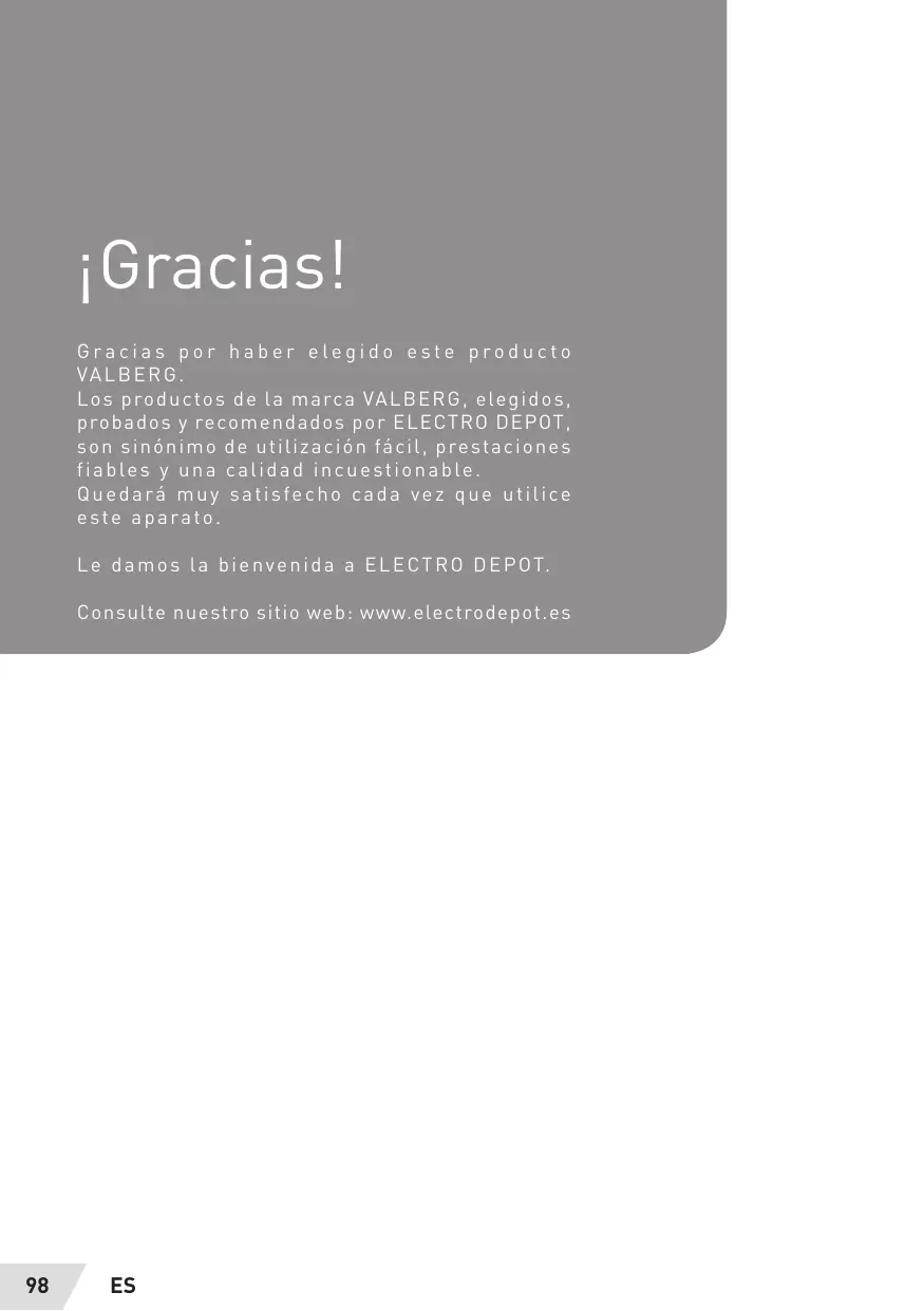 jGraciasl Gracias por haber elegido este producto VALBERG. Los productos de La marca VALBERG, elegidos, probados y recomendados por ELECTRO DEPOT, son sinénimo de utilizaciôn fâcil, prestaciones fiables y una calidad incuestionable Quedar4 muy satisfecho cada vez que utilice este aparato Le damos la bienvenida a ELECTRO DEPOT. Consulte nuestro sitio web: www.electrodepot.es