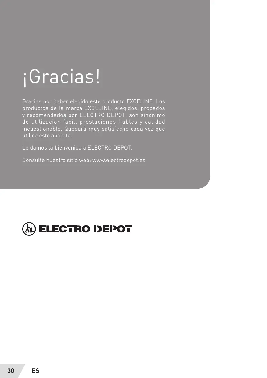 jGraciasl Gracias por haber elegido este producto EXCELINE. Los productos de la marca EXCELINE, elegidos, probados y recomendados por ELECTRO DEPOT, son sinénimo de utilizaciôn fâcil, prestaciones fiables y calidad incuestionable. Quedar muy satisfecho cada vez que utilice este aparato. Le damos la bienvenida a ELECTRO DEPOT. Consulte nuestro sitio web: www.electrodepot.es >TRO DEPOT