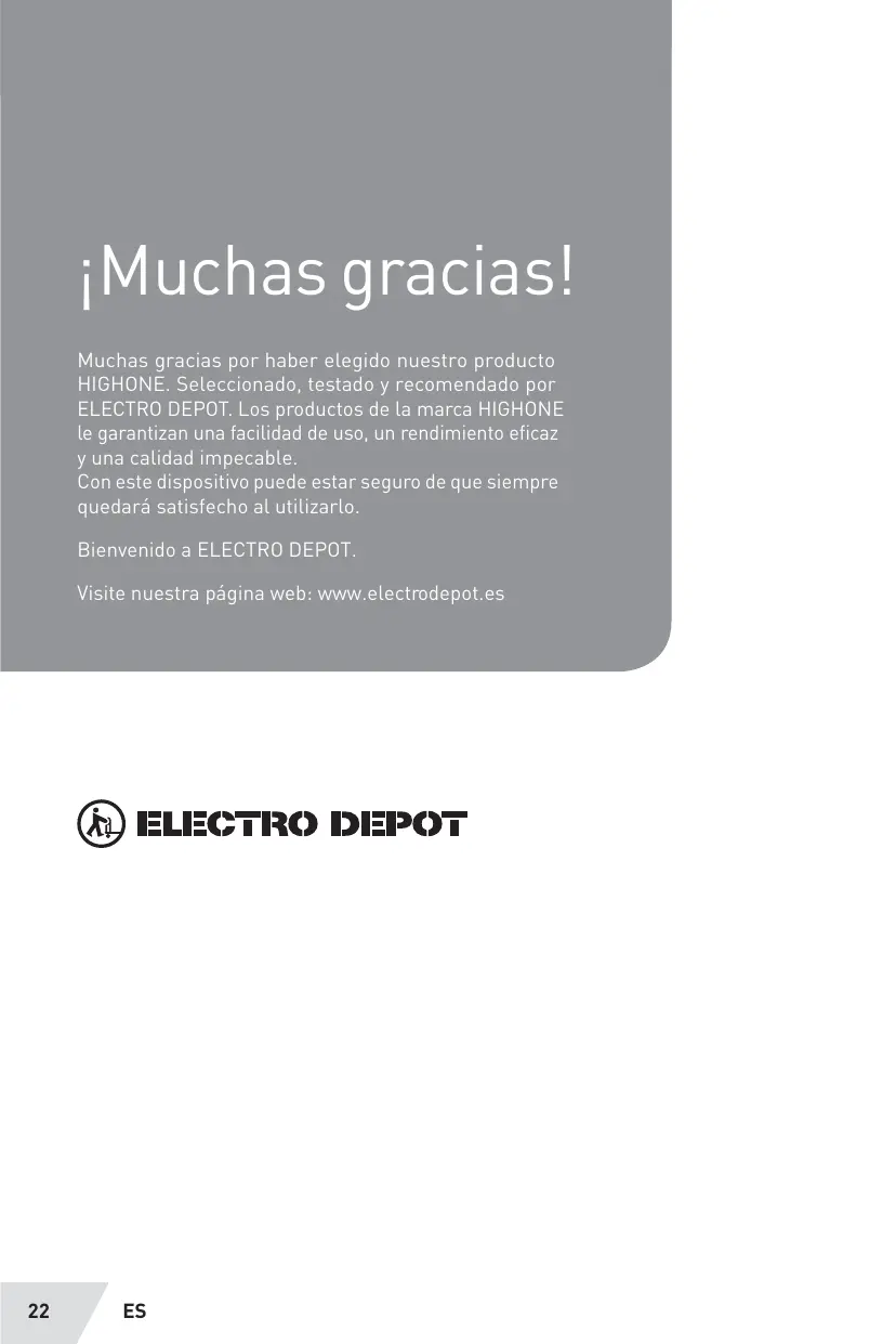 Muchas THANKAS por haber elegido nuestro producto HIGHONE. SeLECTIONADO, testado y recomendado por ELECTRO DEPOT. Los produits de lamarca HIGHONE le garantizan una calidad de uso, un rendimiento eficaz y una calidad impeccable.