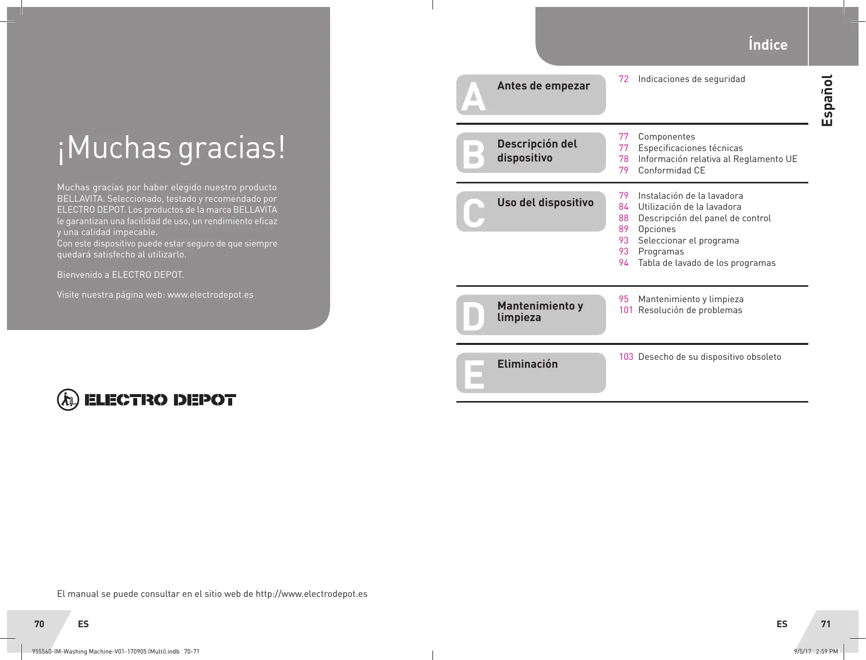 iMuchas graciasl! Muchas gracias por haber elegido nuestro producto BELLAVITA. Seleccionado, testado y recomendado por ELECTRO DEPOT. Los productos de la marca BELLAVITA le garantizan una facilidad de uso, un rendimiento eficaz y una calidad impecable. Con este dispositivo puede estar seguro de que siempre quedarä satisfecho al utilizarlo. Bienvenido a ELECTRO DEPOT. Visite nuestra pägina web: www.electrodepot.es >TRO DEPOT El manual se puede consultar en el sitio web de http://www.electrodepot.es