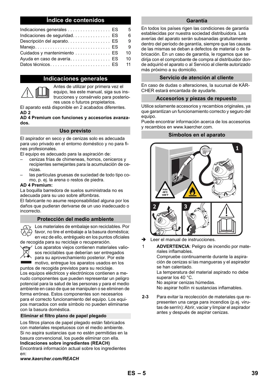 indice de contenidos Indicaciones generales . ES 5 Indicaciones de seguridad ES 6 Descripciôn del aparato... ES 9 Manejo.…….......... ES 9 Cuidados y mantenimiento ES 10 Ayuda en caso de averia ES 10 Datos técnicos... ES 1 Indicaciones generales Antes de utilizar por primera vez el ÂÀ equipo, lea este manual, siga sus ins- trucciones y consérvelo para posterio- res usos 0 futuros propietarios. El aparato est disponible en 2 acabados diferentes. AD 2 AD 4 Premium con funciones y accesorios avanza- dos. Uso previsto El aspirador en seco y de cenizas solo es adecuada para uso privado en el entomo doméstico y no para fi- nes profesionales. El equipo es adecuado para la aspiraciôn de: — cenizas frias de chimeneas, hornos, ceniceros y recipientes semejantes para la acumulaciôn de ce- nizas. — las particulas gruesas de suciedad de todo tipo co- mo, p. ej. la arena o restos de piedra. AD 4 Premiui La boquilla barredora de suelos suministrada no es adecuada para su uso sobre alfombras. El fabricante no asume responsabiidad alguna por los daños que pudieran derivarse de un uso inadecuado o incorrecto. Protecciôn del medio ambiente Los materiales de embalaje son reciclables. Por Là favor, no tire el embalaje a la basura doméstica; envez de ello, entréguelo en los puntos oficiales de recogida para su reciclaje o recuperacién. Los aparatos viejos contienen materiales valio- TT sos reciclables que deberian ser entregados para su aprovechamiento posterior. Por este == mofivo, entregue los aparatos usados en los puntos de recogida previstos para su reciclaje. Los equipos eléctricos y electrônicos contienen a me- nudo componentes que pueden representar un peligro potencial para la salud de las personas y para el medio ambiente en caso de que se manipulen 0 se eliminen de forma errônea. Estos componentes son necesarios para el correcto funcionamiento del equipo. Los equi- pos marcados con este simbolo no pueden eliminarse con la basura doméstica Eliminar el filtro plano de papel plegado Los fitros planos de papel plegado estän fabricados con materiales respetuosos con el medio ambiente. Si no aspira sustancias que no estén permitidas en la basura convencional, los puede eliminar con ella. Indicaciones sobre ingredientes (REACH) Encontraré informaciôn actual sobre los ingredientes en: www.kaercher.com/REACH Garantia En todos los paises rigen las condiciones de garantia establecidas por nuestra sociedad distribuidora. Las averias del aparato serän subsanadas gratuitamente dentro del periodo de garantia, siempre que las causas de las mismas se deban a defectos de material o de fa- bricacién. En un caso de garanti, le rogamos que se dirija con el comprobante de compra al distribuidor don- de adquirié el aparato o al Servicio al cliente autorizado més prôximo a su domicilio. Servicio de atenciôn al cliente En caso de dudas o alteraciones, la sucursal de KÂR- CHER estaré encantada de ayudarle Accesorios y piezas de repuesto Utiice solamente accesorios y recambios originales, ya que garantizan un funcionamiento correcto y seguro del equipo. Puede encontrar informacién acerca de los accesorios y recambios en www.kaercher.com. Simbolos en el aparato + Leer el manual de instrucciones. 1 ADVERTENCIA: Peligro de incendio por mate- riales inflamables. Compruebe continuamente durante la aspira- ciôn de cenizas si las mangueras y el aspirador se han calentado. La temperatura del material aspirado no debe superar los 40 °C. No aspirar cenizas hümedas. No aspirar hollin ni sustancias inflamables. 2-3 Para evitar la recoleccién de materiales que re- presenten una carga para incendios (p.ej. viru- tas de serrin): Abrir, vaciar y limpiar el aspirador antes y después de aspirar cenizas. ES -5
