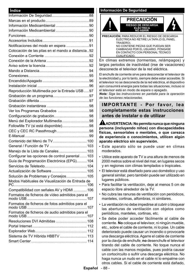 Informaciôn De Seguridad. Marcas en el producto. Informaciôn Medioambiental Informaciôn Medioambiental Funciones … Accesorios Incluidos…. . Notificaciones del modo en espera .91 Colocaciôn de las pilas en el mando a distancia..92 Conexiôn a Coriente Conexiôn de la Antena Aviso sobre la licencia. Mando a Distancia Conexiones... . Encendido/Apagado Instalaciôn inicial … Reproduccién Multimedia por la Entrada USB. 97 Grabaciôn de un programa.… Grabaciôn diferida …… Grabaciôn instantänea Ver los Programas Grabados Configuracién de grabaciôn. Menû del Explorador Multimedia. FollowMe TV (si estä disponible). CEC y CEC RC Passthrough E-Manual