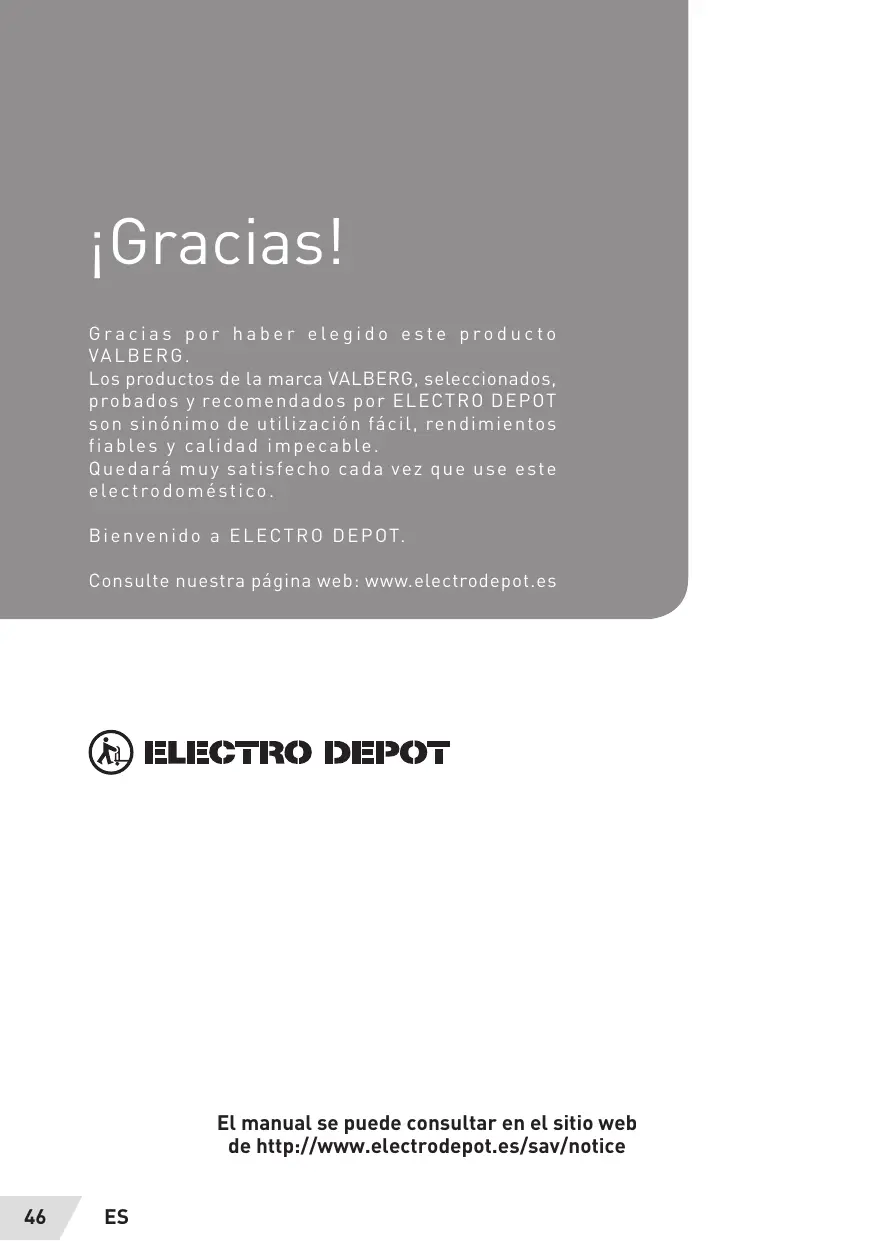 jGraciasl Gracias por haber elegido este producto VALBERG. Los productos de La marca VALBERG, seleccionados, probados y recomendados por ELECTRO DEPOT son sinénimo de utilizacién fcil, rendimientos fiables y calidad impecable. Quedarä muy satisfecho cada vez que use este electrodoméstico Bienvenido a ELECTRO DEPOT. Consulte nuestra pâgina web: www.electrodepot.es El manual se puede consultar en el sitio web de http://www.electrodepot.es/sav/notice 46 ES