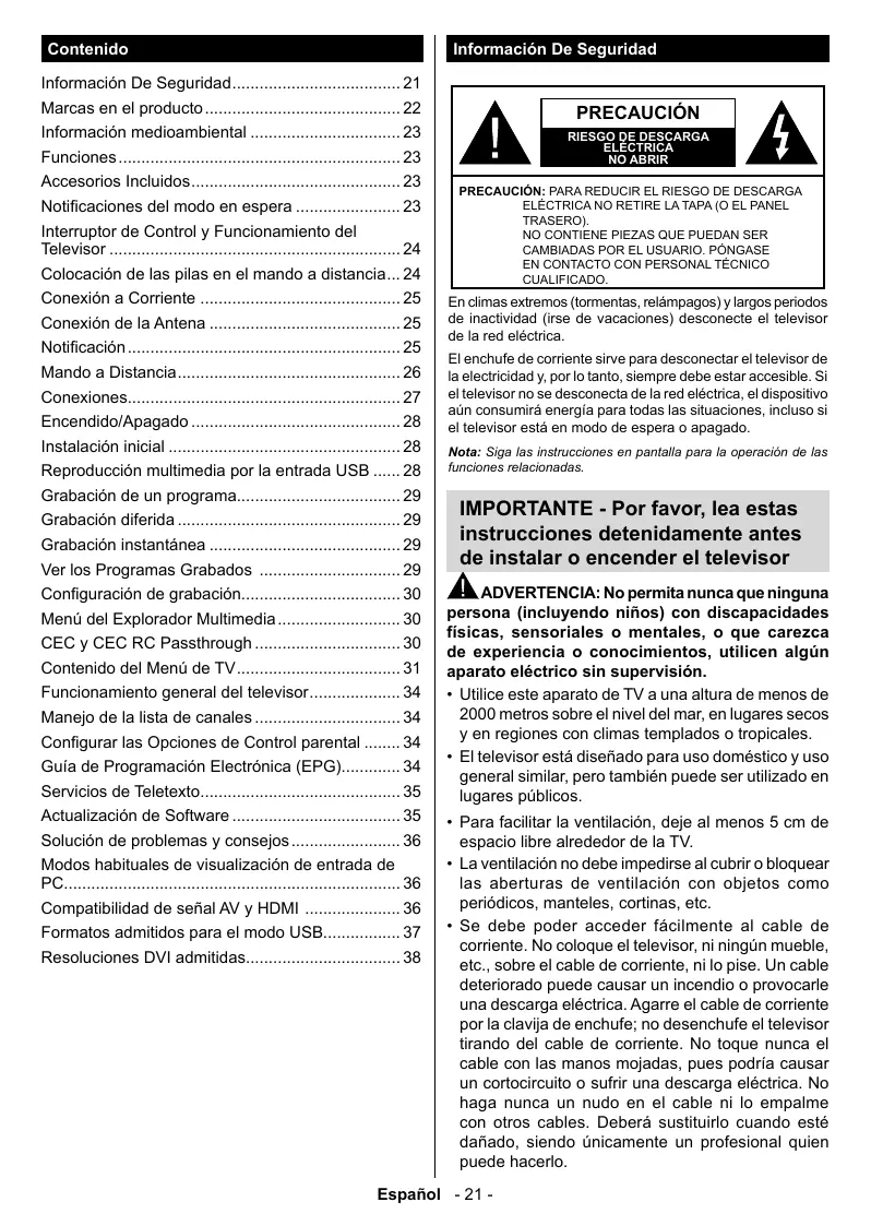 AV. | Cuando reciba señal de canales DTV (Mpeg4 H.264) o mientras esté desplazändose por el explorador multimedia, no habré salida posible a través del euroconector. Cuando se utiliza el kit de montaje en pared (disponible a partir de terceros en el mercado. si no suministrado), le recomendamos que conecte todos los cables a la parte posterior del televisor antes de montar en la pared. Introduzca o extraiga el médulo de interfaz comün (CI) solamente si el televisor esté APAGADO. Consulte el manual de instrucciones del médulo para obtener més informacién sobre sus ajustes. Cada entrada USB del televisor admite dispositivos de hasta 600mA. Los dispositivos con valores superiores à 500mA podrian dañar al televisor. Seré necesario que utlice un cable aislado HDMI, al conectarlo al televisor, para garantizar la méxima protecciôn frente & radiaciôn parasitaria de frecuencias.
