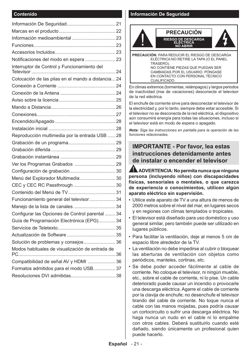 Introduzca o extraiga el médulo de interfaz comün (CI) solamente si el televisor esté APAGADO. Consulte el manual de instrucciones del médulo para obtener més informaciôn sobre sus ajustes. Cada entrada USB del televisor admite dispositivos de hasta 600mA. Los dispositivos con valores superiores à 500mA podrian dañar al televisor. Seré necesario que utlice un cable aislado HDMI, al conectarlo al televisor, para garantizar la méxima protecciôn frente & radiaciôn parasitaria de frecuencias.