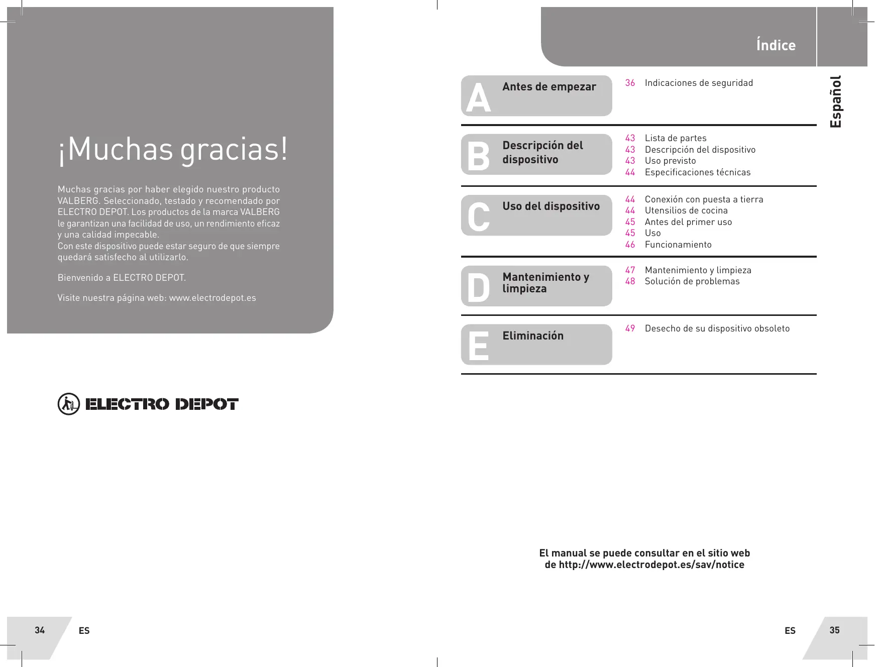 Indicaciones de seguridad PRE 43 Lista de partes Descripcién del 43 Descripcién del dispositivo dispo 43 Uso previsto 44 Especificaciones técnicas = ra 44 Conexiôn con puesta a tierra Uso del dispositivo | ;; Utensitios de cocina 45 Antes del primer uso 45 Uso 46 Funcionamiento ne 47. Mantenimiento y limpieza Mantenimiento y 48 Solucién de problemas limpieza #4 a 49. Desecho de su dispositivo obsoleto Eliminaciôn ? El manual se puede consultar en el sitio web de http://www.electrodepot.es/sav/notice