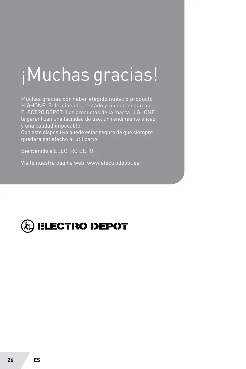 iMuchas graciasl! Muchas gracias por haber elegido nuestro producto HIGHONE. Seleccionado, testado y recomendado por ELECTRO DEPOT. Los productos de la marca HIGHONE le garantizan una facilidad de uso, un rendimiento eficaz y una calidad impecable Con este dispositivo puede estar seguro de que siempre quedaré satisfecho al utilizarl Bienvenido a ELECTRO DEPOT. Visite nuestra pâgina web: www.electrodepot.es