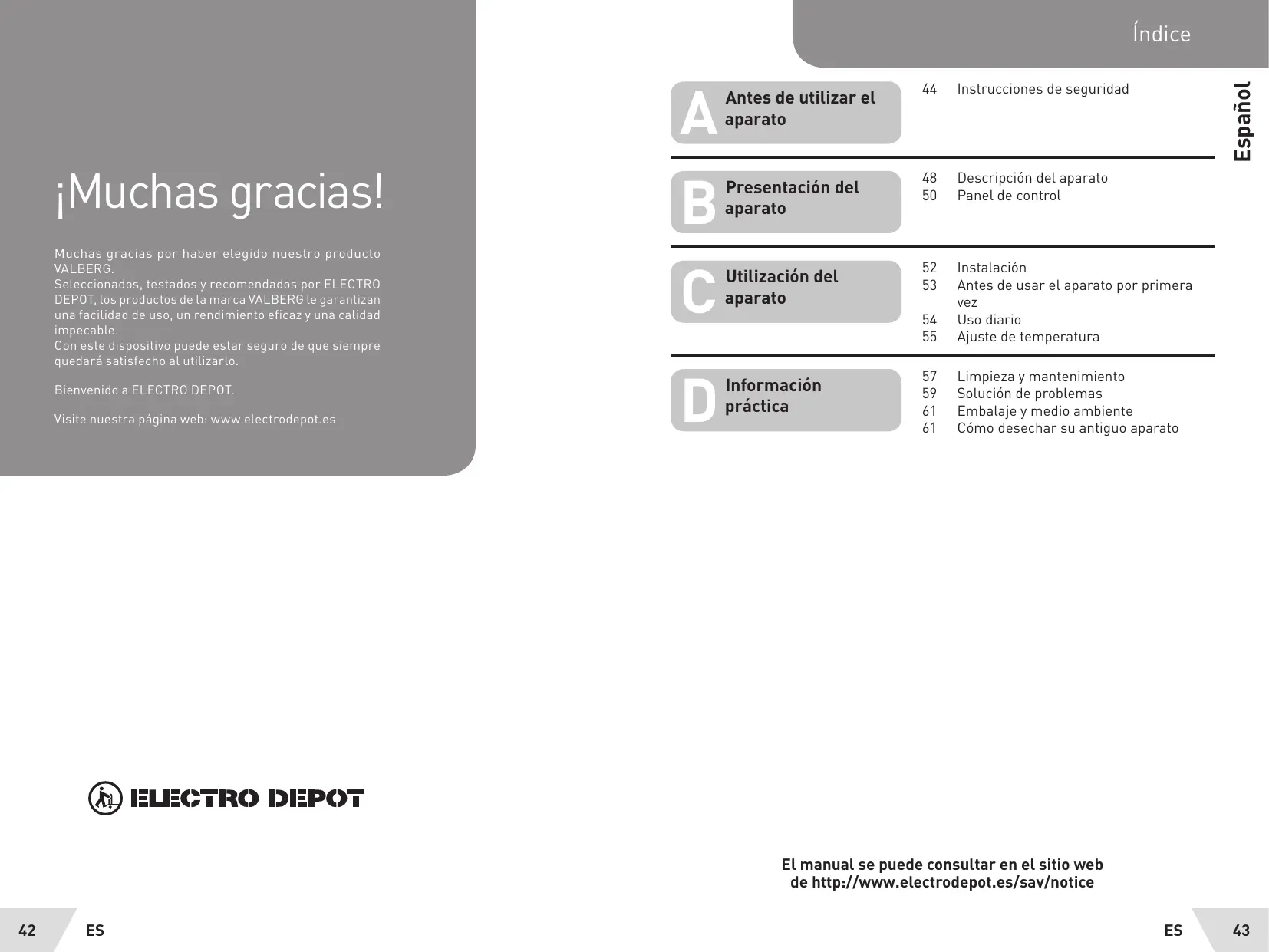 pa 48 Descripcién del aparato Presentacién del 50 Panelde control aparato RE 52 Instalacién Utilizaciôn del 53 Antes de usar el aparato por primera aparato vez 54 Uso diario 55 Ajuste de temperatura a 57 Limpieza y mantenimiento Informaciôn 59 Solucién de problemas präctica 61 Embalaje y medio ambiente 61 Cémo desechar su antiguo aparato El manual se puede consultar en el sitio web de http://www.electrodepot.es/sav/notice ES 43