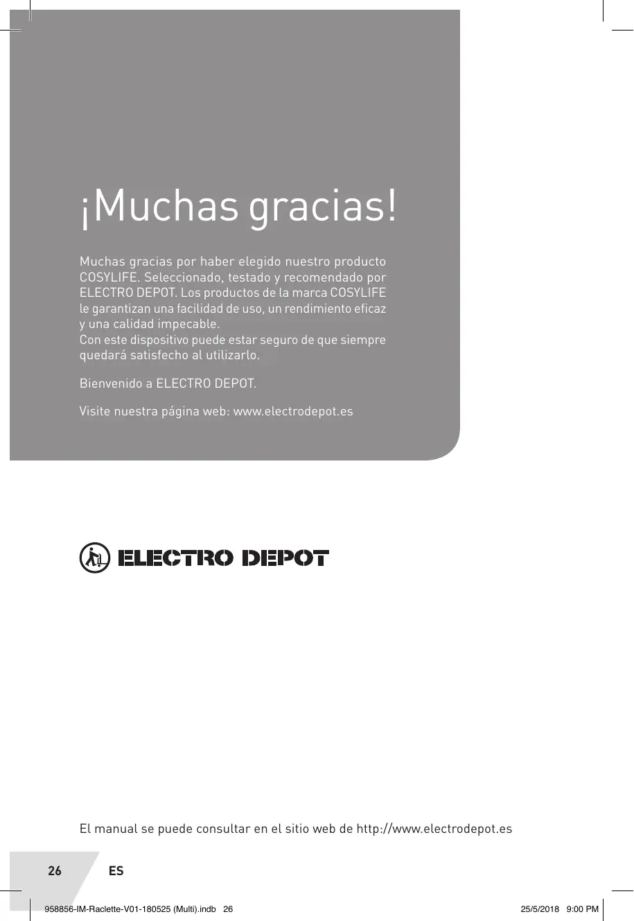 iMuchas gracias! Muchas gracias por haber elegido nuestro producto COSYLIFE. Seleccionado, testado y recomendado por ELECTRO DEPOT. Los productos de La marca COSYLIFE le garantizan una facilidad de uso, un rendimiento eficaz y una calidad impecable. Con este dispositivo puede estar seguro de que siempre quedarä satisfecho al utilizarlo. Bienvenido a ELECTRO DEPOT. Visite nuestra pâgina web: www.electrodepot.es >TRO DEPOT El manual se puede consultar en el sitio web de http://www.electrodepot.es 26 ES 258866-IM-Raclette-VO1-180525 (Mult).indb 26 25/8/2018 9:00 PM