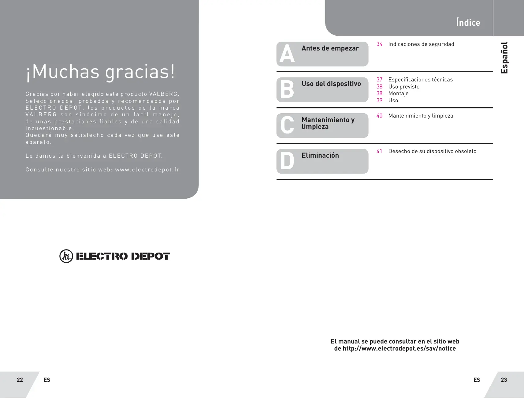 34 Indicacil d' idad rt Antes de empezar ndicaciones de segurida 2 œ [= 1] Lu A a 37 Especificaciones técnicas Uso del dispositivo 38 Uso previsto 38 Montaje 39 Uso Mantenimiento y 40 Mantenimiento y Limpieza limpieza Eniecién 41 Desecho de su dispositivo obsoleto El manual se puede consultar en el sitio web de http://www.electrodepot.es/sav/notice ES 23