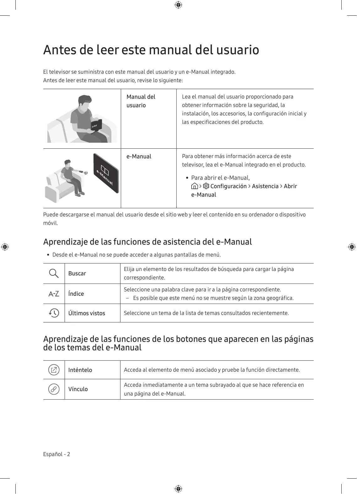 e-Manual Para obtener mäs informacién acerca de este televisor, lea el e-Manual integrado en el producto. + Para abrirele-Manual, (> #8 Configuracién > Asistencia > Abrir e-Manual Puede descargarse el manual del usuario desde el sitio web y Leer el contenido en su ordenador o dispositivo mvil. " Aprendizaje de las funciones de asistencia del e-Manual + Desde el e-Manual no se puede acceder a algunas pantallas de menü. A Buscar correspondiente. Elija un elemento de los resultados de büsqueda para cargar La pâgina AZ | indice Seleccione una palabra clave para ir à La pâgina correspondiente. — Es posible que este menû no se muestre segün La zona geogräfica. Ültimos vistos Seleccione un tema de la lista de temas consultados recientemente. Aprendizaje de las funciones de los botones que aparecen en las pâginas de los temas del e-M anual © Inténtelo Acceda al elemento de menû asociado y pruebe la funciôn directamente. @ Vinculo una pégina del e-Manual. Acceda inmediatamente à un tema subrayado al que se hace referencia en Español - 2