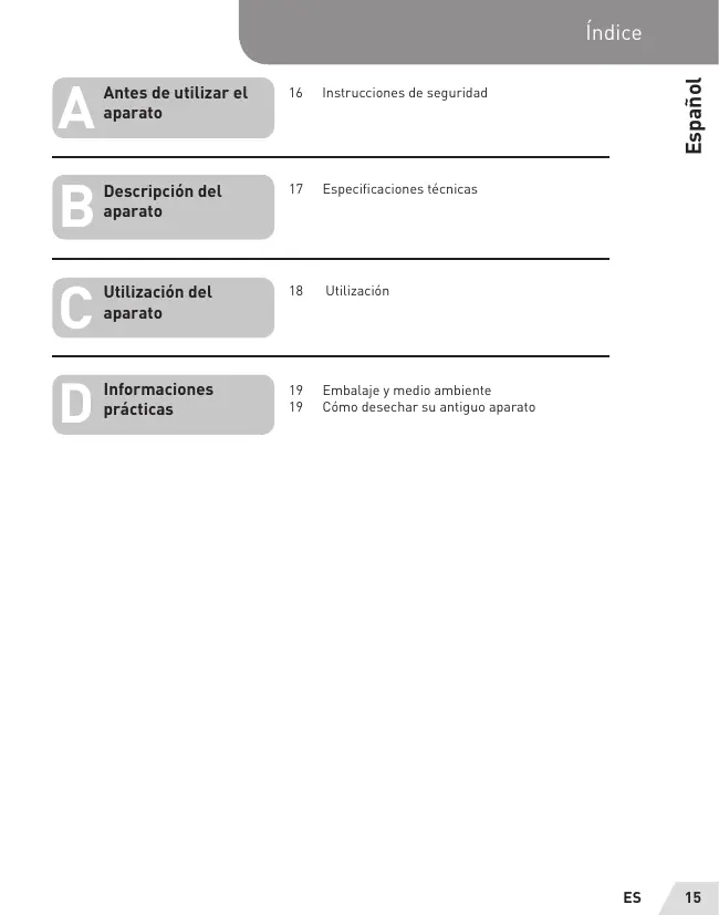 Indi A 16. Instrucciones de seguridad ce 17 Especificaciones técnicas DE 19. Embalaje y medio ambiente