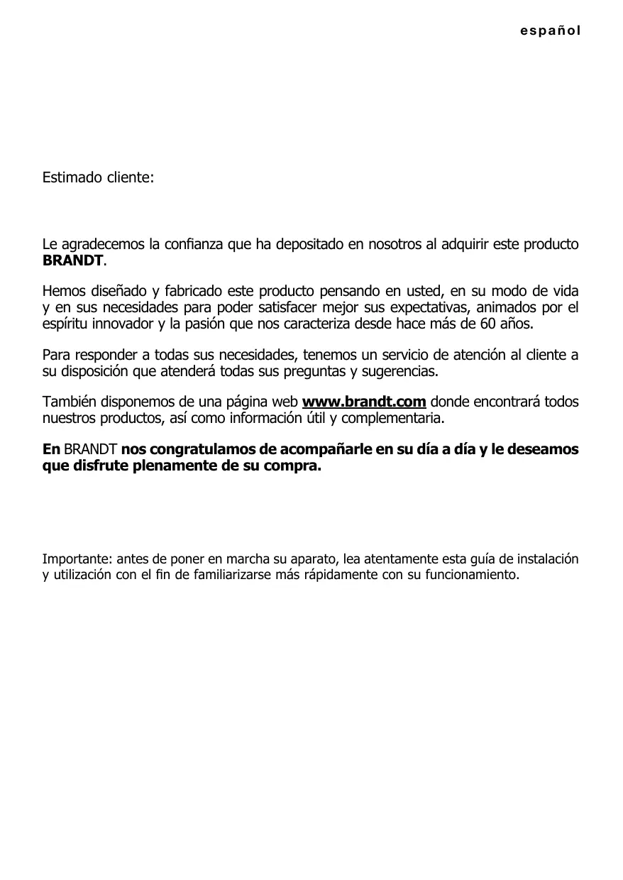 español Estimado cliente: Le agradecemos la confianza que ha depositado en nosotros al adquirir este producto BRANDT. Hemos diseñado y fabricado este producto pensando en usted, en su modo de vida y en sus necesidades para poder satisfacer mejor sus expectativas, animados por el espiritu innovador y la pasiôn que nos caracteriza desde hace més de 60 años. Para responder a todas sus necesidades, tenemos un servicio de atenciôn al diiente a su disposiciôn que atenderé todas sus preguntas y sugerencias. También disponemos de una pâgina web www.brandt.com donde encontraré todos nuestros productos, asi como informacién ütil y complementaria. En BRANDT nos congratulamos de acompañarle en su dia a dia y le deseamos que disfrute plenamente de su compra. Importante: antes de poner en marcha su aparato, lea atentamente esta guia de instalaciôn y utilizaciôn con el fin de familiarizarse mâs râpidamente con su funcionamiento.