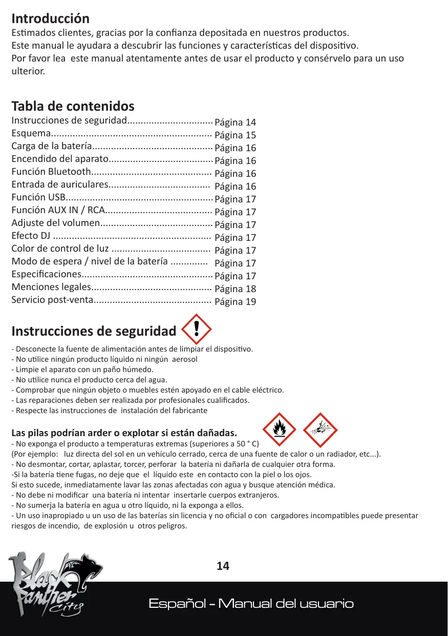 Introducciôn Estimados clientes, gracias por la confianza depositada en nuestros productos. Este manual le ayudara a descubrir las funciones y caracteristicas del dispositivo. Por favor lea este manual atentamente antes de usar el producto y consérvelo para un uso ulterior. Tabla de contenidos Instrucciones de seguridad. Esquema.. Carga de la bateria. Encendido del aparato Funcién Bluetooth. Entrada de auriculares.. Funcién USB... Funciôn AUX IN / RCA. Adjuste del volumen Efecto DJ .. Color de control de luz . Modo de espera / nivel de la bateria . Especificaciones.. Menciones legales. u Servicio post-venta.… . Instrucciones de seguridad Où - Desconecte la fuente de alimentaciôn antes de limpiar el dispositivo. - No utilice ningün producto liquido ni ningén aerosol - Limpie el aparato con un paño hümedo. - No utilice nunca el producto cerca del agua - Comprobar que ningün objeto o muebles estén apoyado en el cable eléctrico. - Las reparaciones deben ser realizada por profesionales cualificados. - Respecte las instrucciones de instalaciôn del fabricante - Pâgina 17 Pägina 17 Las pilas podrian arder o explotar si estän dañadas. - No exponga el producto a temperaturas extremas (superiores a 50 * C) (Por ejemplo:_luz directa del sol en un vehiculo cerrado, cerca de una fuente de calor o un radiador, etc...). - No desmontar, cortar, aplastar, torcer, perforar la bateria ni dañiarla de cualquier otra forma. -Si la bateria tiene fugas, no deje que el liquido este en contacto con la piel o los ojos. Si esto sucede, inmediatamente lavar las zonas afectadas con agua y busque atencién médica. - No debe ni modificar una bateria ni intentar insertarle cuerpos extranjeros. - No sumerja la bateria en agua u otro liquido, ni la exponga a ellos. - Un uso inapropiado u un uso de las baterias sin licencia y no oficial o con cargadores incompatibles puede presentar riesgos de incendio, de explosién u otros peligros. Español - Manual del usuario