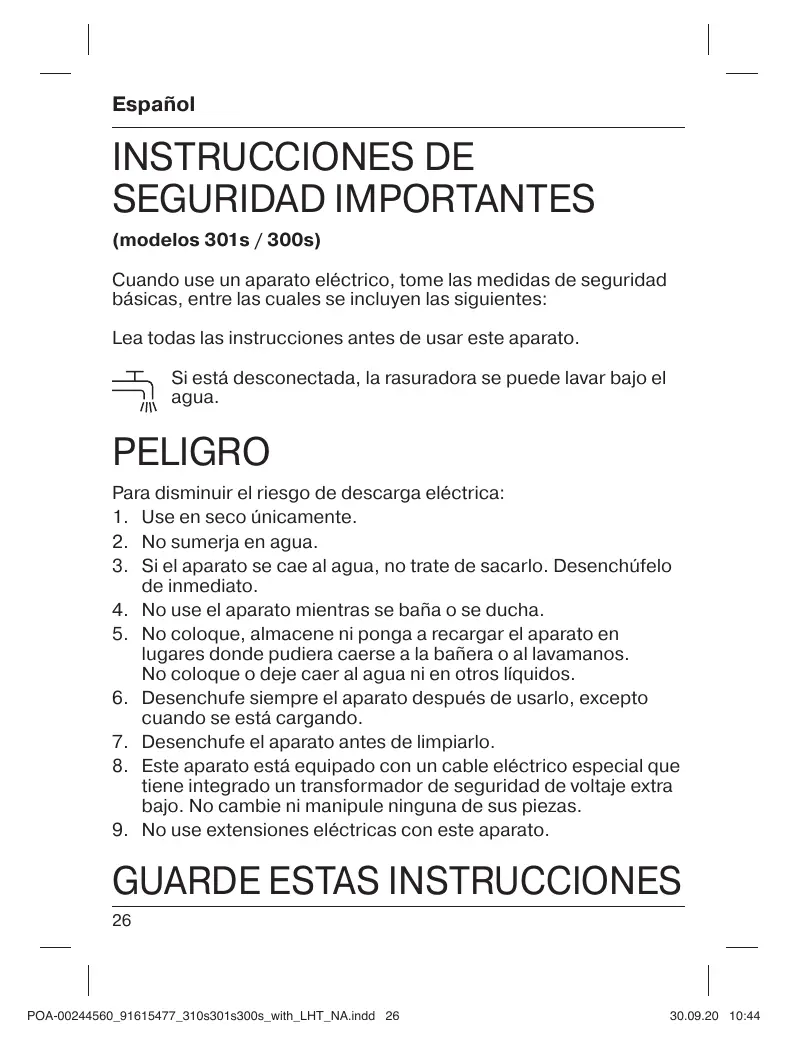 PELIGRO Para disminuir el riesgo de descarga eléctrica: 1. Use en seco ünicamente. 2. No sumerja en agua.