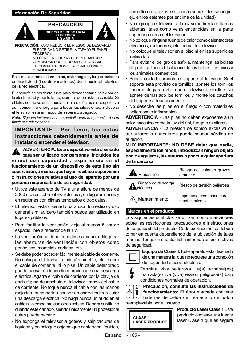 Los siguientes simbolos se utlizan como marcadores sobre las restricciones, precauciones e instrucciones de seguridad del producto. Cada explicaciôn se deberä tomar en cuenta dependiendo de la ubicaciôn de tales marcas. Tenga en cuenta dicha informaciôn por motivos de seguridad. Equipo de Clase II: Este aparato estä diseñado [[] | de una manera tal que no requiere una conexion de seguridad a tierra eléctrica. Terminal viva peligrosa: La(s) terminal(es) L marcada(s) live (viva) es/son peligrosa(s) bajo condiciones normales de operaciôn. 31 Precauciôn, consulte las instrucciones de [A] J | funcionamiento: El ârea marcada contiene baterias de celda de moneda o de botôn reemplazable por el usuario. Producto Läser Clase 1 Este producto contiene una fuente léser Clase 1 que es segura