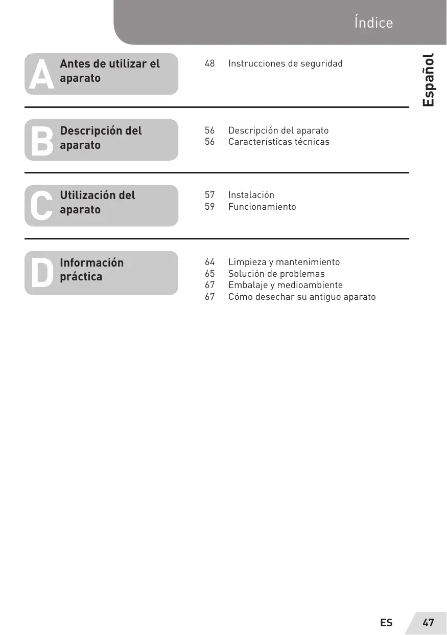 ES Antes de utilizar el 48 Instrucciones de seguridad aparato Descripciôn del 56 Descripcién del aparato aparato 56 Caracteristicas técnicas Utilizaciôn del 57 _Instalacién aparato 59 Funcionamiento Informaciôn 64 Limpieza y mantenimiento préctica 65 Soluciôn de problemas