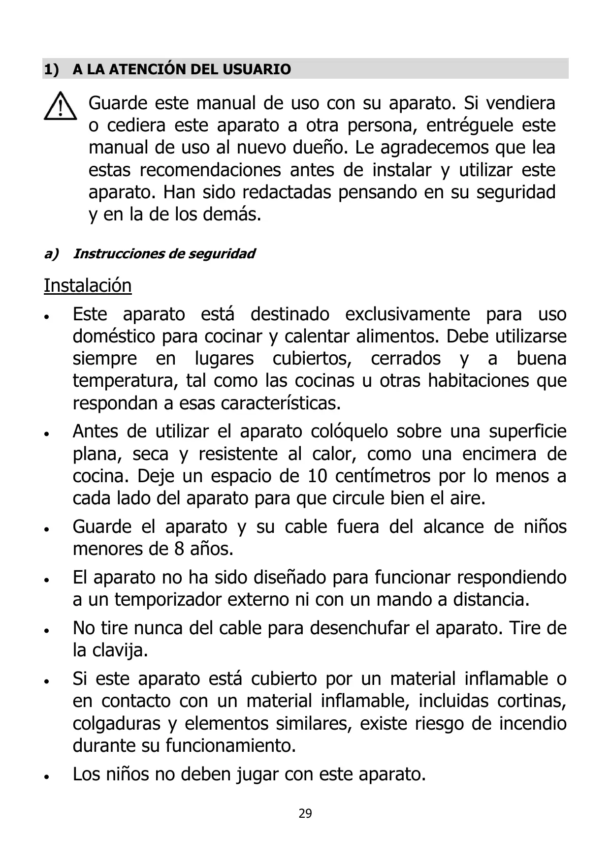 Este aparato esté destinado exclusivamente para uso doméstico para cocinar y calentar alimentos. Debe utilizarse siempre en lugares cubiertos, cerrados ÿ a buena temperatura, tal como las cocinas u otras habitaciones que respondan a esas caracteristicas.