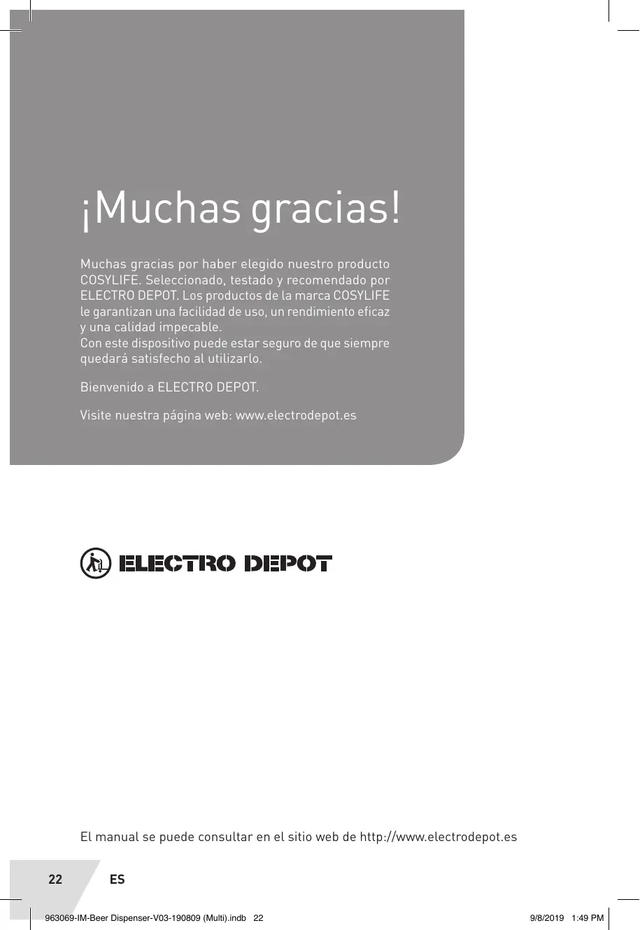 iMuchas gracias! Muchas gracias por haber elegido nuestro producto COSYLIFE. Seleccionado, testado y recomendado por ELECTRO DEPOT. Los productos de La marca COSYLIFE le garantizan una facilidad de uso, un rendimiento eficaz y una calidad impecable. Con este dispositivo puede estar seguro de que siempre quedarä satisfecho al utilizarlo. Bienvenido a ELECTRO DEPOT. Visite nuestra pâgina web: www.electrodepot.es >TRO DEPOT El manual se puede consultar en el sitio web de http://www.electrodepot.es 22 ES 263069-IM-Beer Dispenser-VO3-190809 (Mutt).indb 22 98/2019 1:49 PM