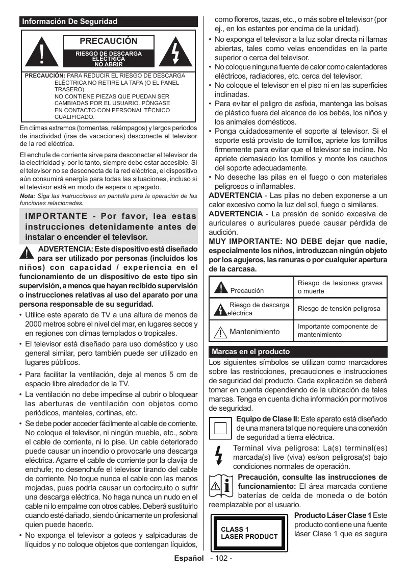 GUALIFICADO. En dlimas extremos (tormentas, relémpagos) y largos periodos de inactividad (irse de vacaciones) desconecte el televisor de la red eléctrica. El enchufe de corriente sirve para desconectar el televisor de la electricidad y, por lo tanto, siempre debe estar accesible. Si eltelevisor no se desconecta de la red eléctrica, el dispositivo aün consumiré energia para todas las situaciones, incluso si el televisor estä en modo de espera 0 apagado. Nota: Siga las instrucciones en pantalla para la operaciôn de las funciones relacionades. IMPORTANTE - Por favor, lea estas instrucciones detenidamente antes de instalar o encender el televisor. ADVERTENCIA: Este dispositivo estä diseñado para ser utilizado por personas (incluidos los niños) con capacidad / experiencia en el funcionamiento de un dispositivo de este tipo sin supervisiôn, a menos que hayan recibido supervisiôn o instrucciones relativas al uso del aparato por una persona responsable de su seguridad. + Utlice este aparato de TV a una altura de menos de 2000 metros sobre el nivel del mar, en lugares secos y en regiones con climas templados o tropicales. El televisor esté diseñado para uso doméstico y uso general similar, pero también puede ser utilizado en lugares püblicos. Para faciltar la ventilaciôn, deje al menos 5 cm de espacio libre alrededor de la TV. La ventilaciôn no debe impedirse al cubrir o bloquear las aberturas de ventilaciôn con objetos como periédicos, manteles, cortinas, etc. Se debe poder acceder fâcimente al cable de corriente. No coloque el televisor, ni ningün mueble, etc. sobre el cable de corriente, ni lo pise. Un cable deteriorado puede causar un incendio o provocarle una descarga eléctrica. Agarre el cable de corriente por la clavija de enchufe; no desenchufe el televisor tirando del cable de corriente. No toque nunca el cable con las manos mojadas, pues podria causar un cortocircuito o sufrir una descarga eléctrica. No haga nunca un nudo en el cable nilo empalme con otros cables. Deberä sustituiro cuando esté dañado, siendo ünicamente un profesional quien puede hacerlo. + No exponga el televisor a goteos y salpicaduras de liquidos y no coloque objetos que contengan liquidos, como floreros, tazas, etc., o mäs sobre eltelevisor (por ei. en los estantes por encima de la unidad). + No exponga el televisor a la luz solar directa ni llamas abiertas, tales como velas encendidas en la parte superior o cerca del televisor. No coloque ninguna fente de calor como calentadores eléctricos, radiadores, etc. cerca del televisor. + No coloque el televisor en el piso ni en las superficies inclinadas. Para evitar el peligro de asfixia, mantenga las bolsas de pléstico fuera del alcance de los bebés, los niños y los animales domésticos. Ponga cuidadosamente el soporte al televisor. Si el soporte estä provisto de tomillos, apriete los tornillos firmemente para evitar que el televisor se incline. No apriete demasiado los tomillos y monte los cauchos del soporte adecuadamente. + No deseche las pilas en el fuego o con materiales peligrosos o inflamables. ADVERTENCIA - Las pilas no deben exponerse a un calor excesivo como la luz del sol, fuego o similares ADVERTENCIA - La presiôn de sonido excesiva de auriculares o auriculares puede causar pérdida de audiciôn. MUY IMPORTANTE: NO DEBE dejar que nadie, especialmente los niños, introduzcan ningün objeto porlos agujeros, las ranuras o por cualquier apertura de la carcasa. À Prccaucién Riesgo de lesiones graves © muerte Riesgo de descarga Riesgo de tensiôn peligrosa Acces s peig u importante componente de /\ Mantenimiento mantenimiento, Marcas en el producto Los siguientes simbolos se utlizan como marcadores sobre las restricciones, precauciones e instrucciones de seguridad del producto. Cada explicaciôn se deberä tomar en cuenta dependiendo de la ubicaciôn de tales marcas. Tenga en cuenta dicha informaciôn por motivos de seguridad. Equipo de Clase II: Este aparato estä diseñado [0] | de una manera tal que no requiere una conexion de seguridad a tierra eléctrica. Terminal viva peligrosa: La(s) terminal(es) L marcada(s) live (Viva) es/son peligrosa(s) bajo condiciones normales de operaciôn. 31 Precauciôn, consulte las instrucciones de [A] J | funcionamiento: El ârea marcada contiene baterias de celda de moneda o de botôn reemplazable por el usuario. Producto Läser Clase 1 Este producto contiene una fuente léser Clase 1 que es segura CLASS 1 LASER PRODUCT Español - 102-
