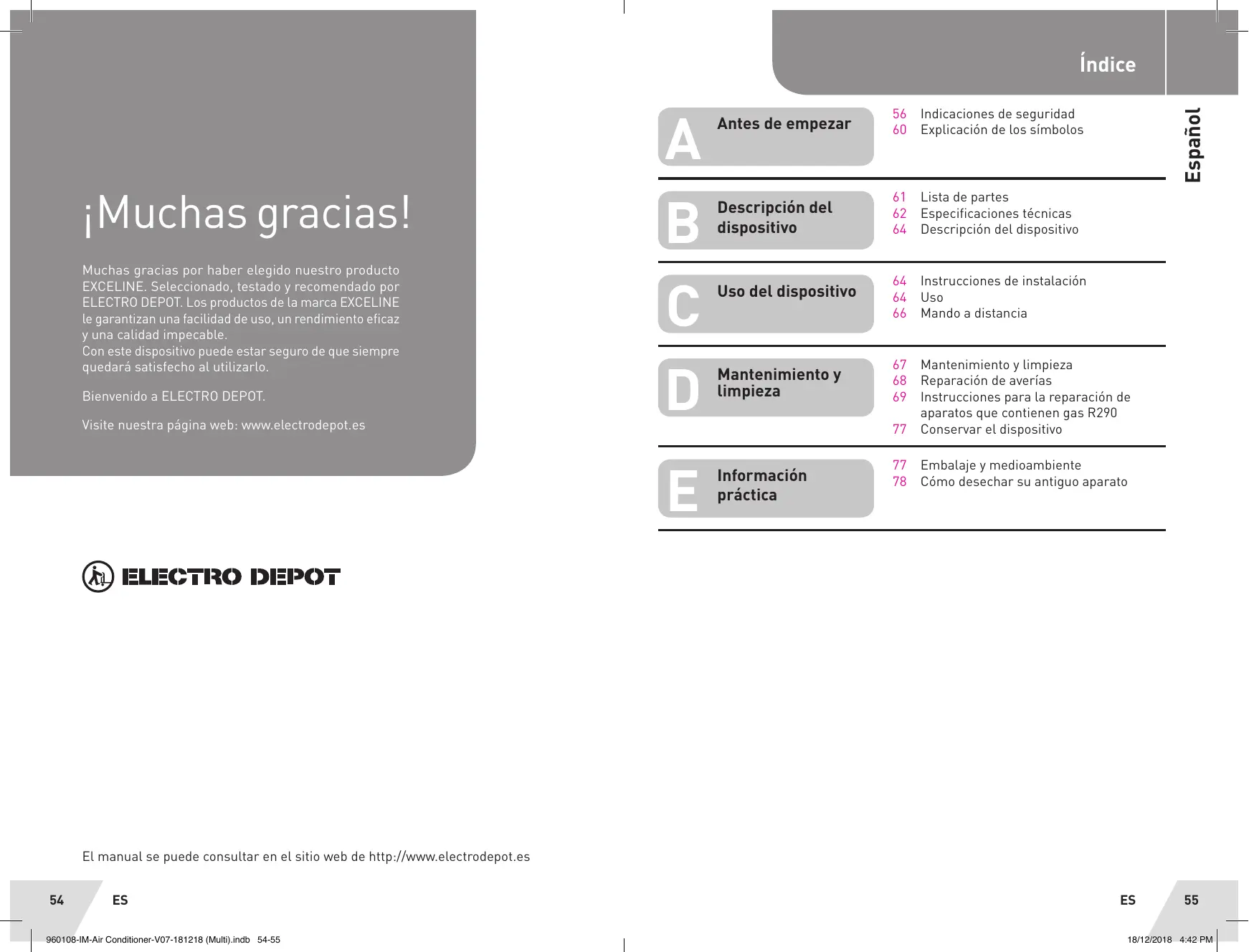 iMuchas gracias! Muchas gracias por haber elegido nuestro producto EXCELINE. Seleccionado, testado y recomendado por ELECTRO DEPOT. Los productos de La marca EXCELINE le garantizan una facilidad de uso, un rendimiento eficaz y una calidad impecable. Con este dispositivo puede estar seguro de que siempre quedarä satisfecho al utilizarlo. Bienvenido a ELECTRO DEPOT. Visite nuestra pâgina web: www.electrodepot.es >TRO DEPOT El manual se puede consultar en el sitio web de http://www.electrodepot.es 54 ES 260108-IM-Air Conditioner-VO7-181218 (Multj.indb 54-55 Antes de empezar