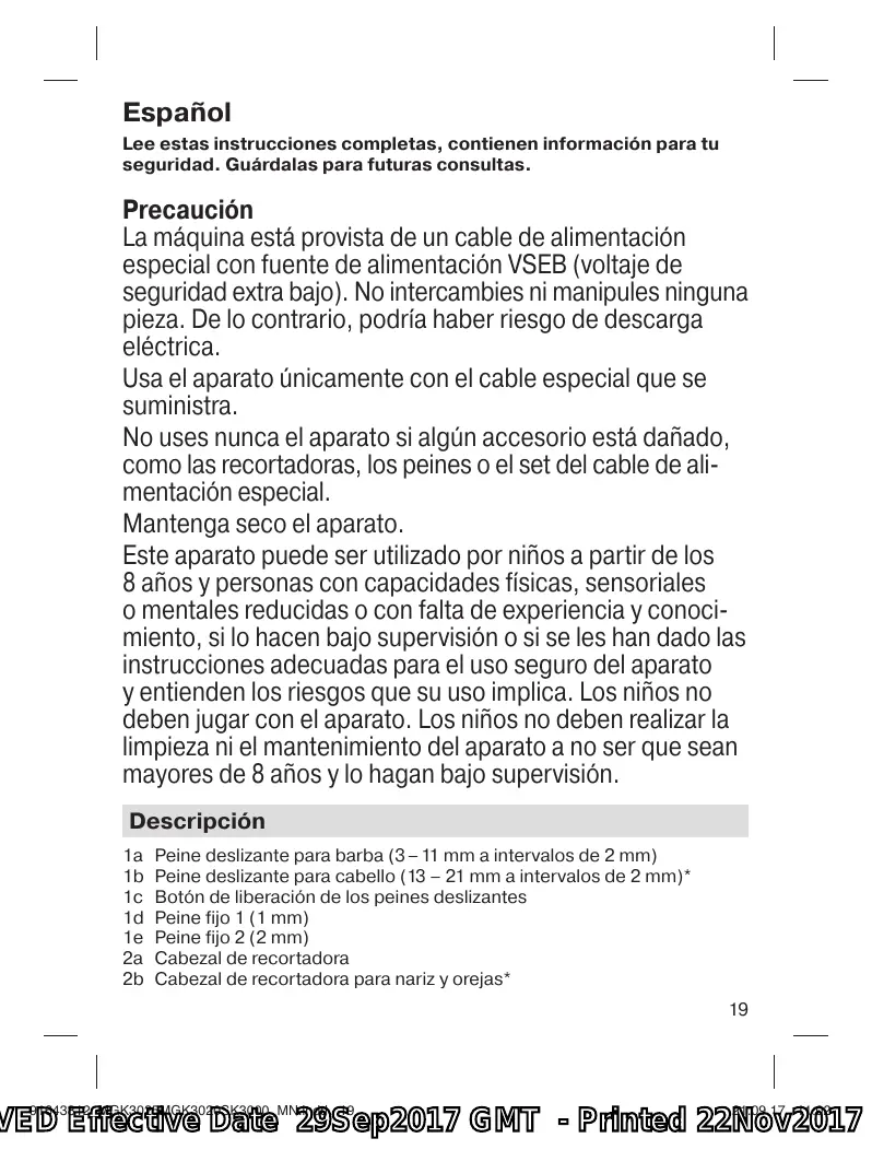 No uses nunca el aparato si algün accesorio est dañado, como las recortadoras, los peines o el set del cable de ali- mentaciôn especial.