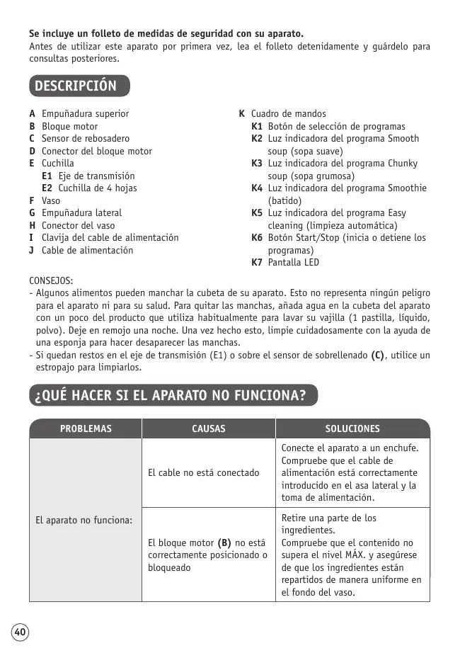 | Funciones principales | Preparación de sopas, salsas y compotas |